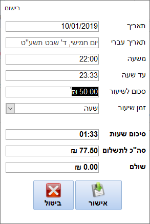יצרתי בעבר לצורך לימוד עם תלמיד, ניתן לבחור כמה זמן זה שיעור/שעה, וכן סכום לשעה וכו'