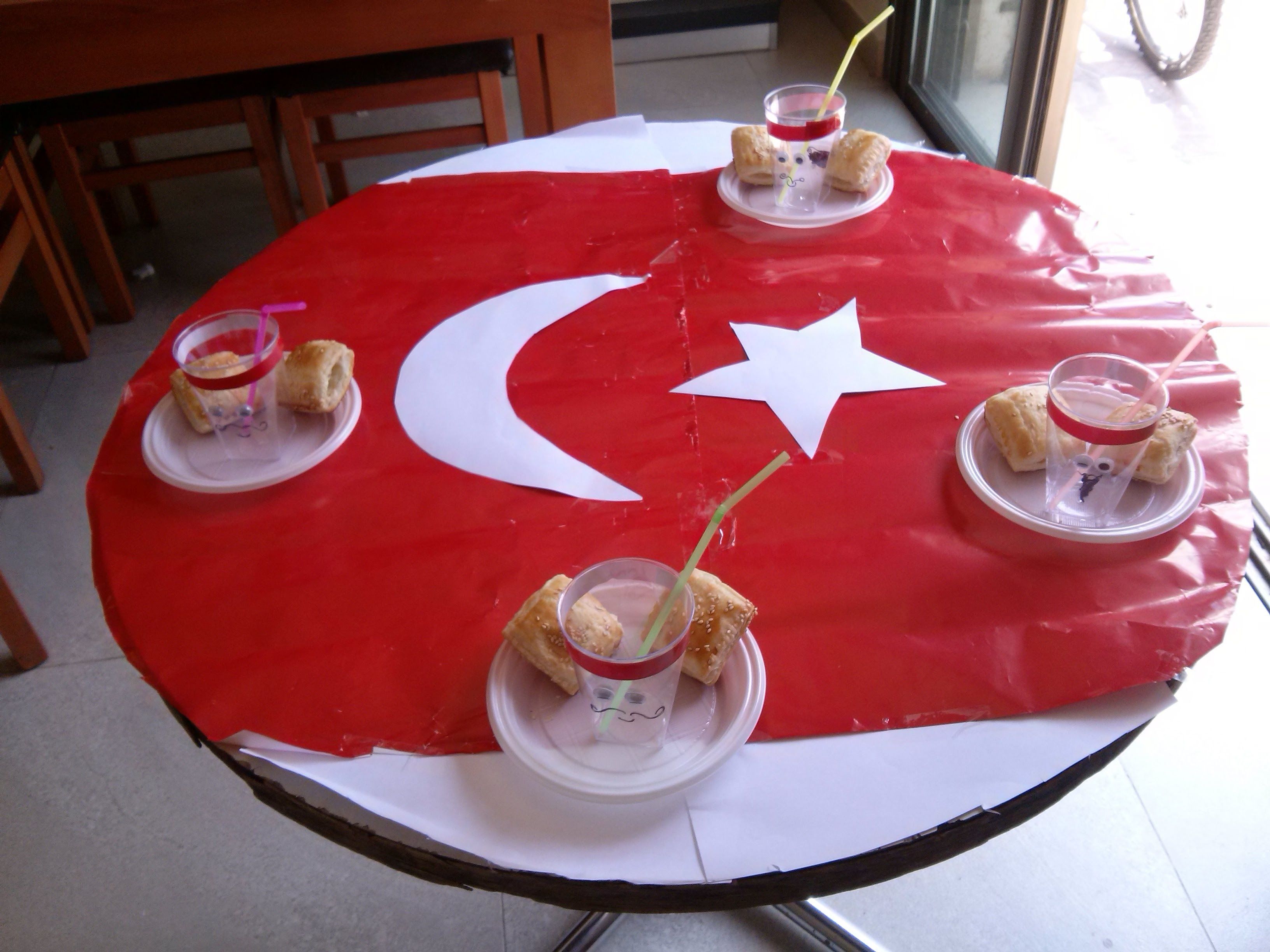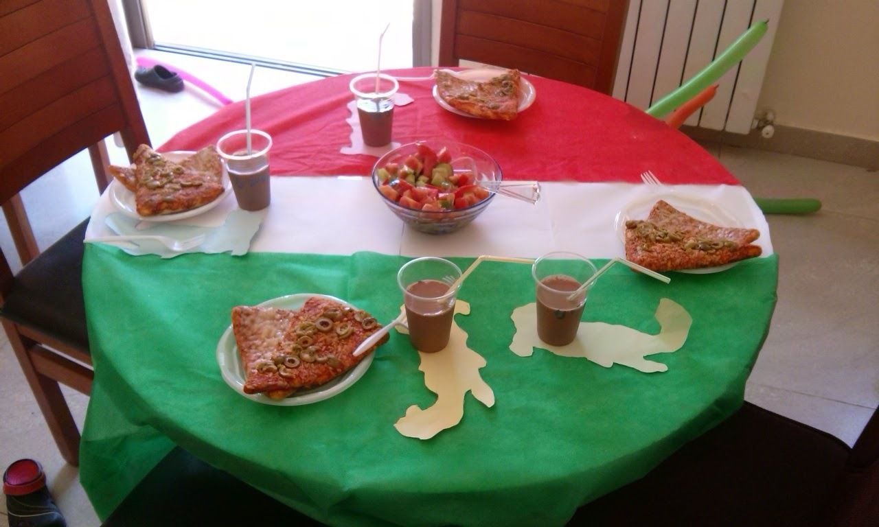 ועוד ארוחה מצחיקה(שאריות מבר מצווה. משהו לא מוגדר ) קראנו לה "ארוחת ג'ונגל" וקשטנו את השולחן בחום וירוק עם "נחשים" מגלילי נייר טואלט גזורים, עצים מעשה ידינו ובובת כפפה תנין בראש בקבוק.