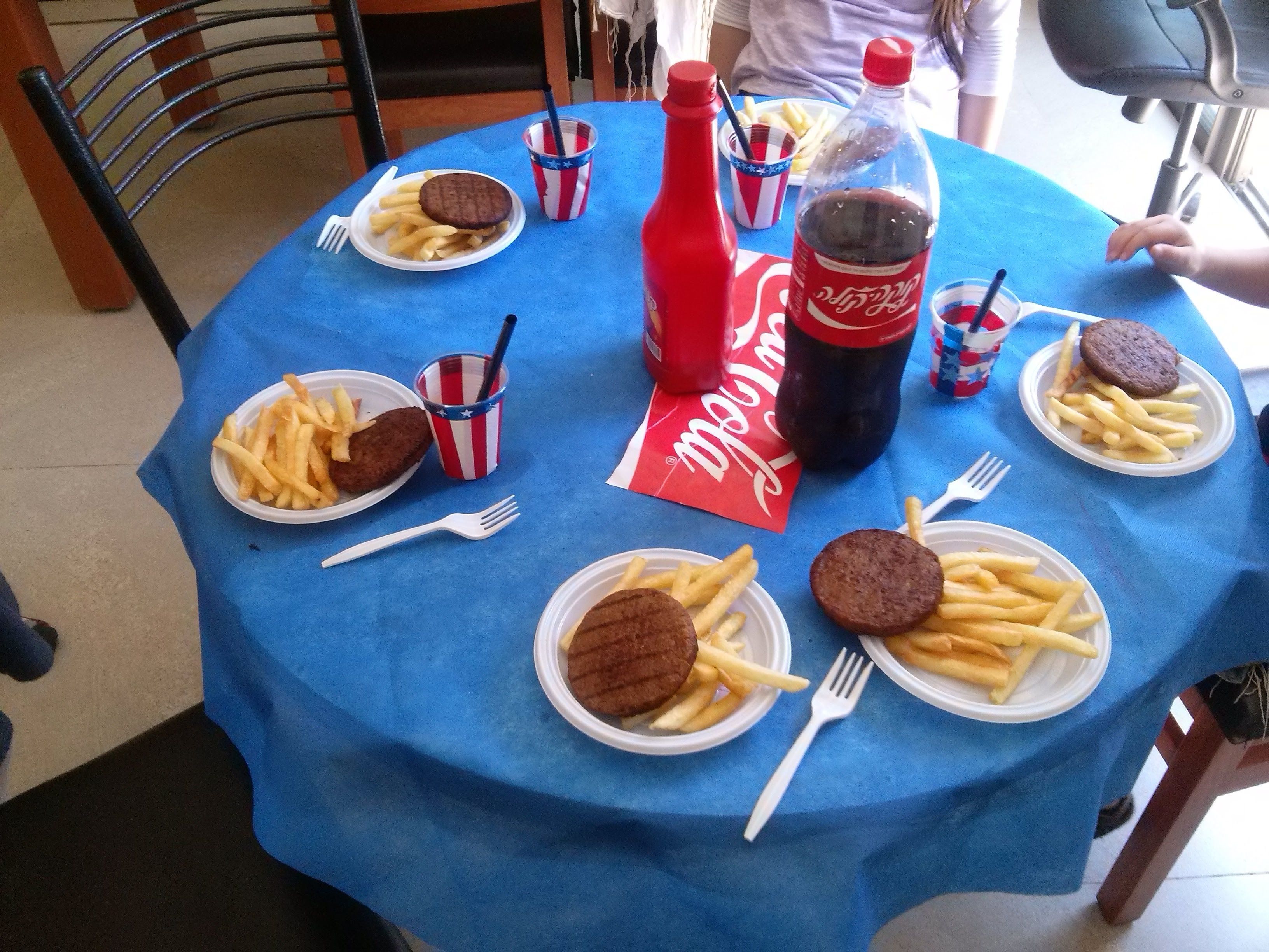 שום מתכונים מיוחדים.אמריקה-צ'יפס, המבורגר, קטשופ וקולה.
