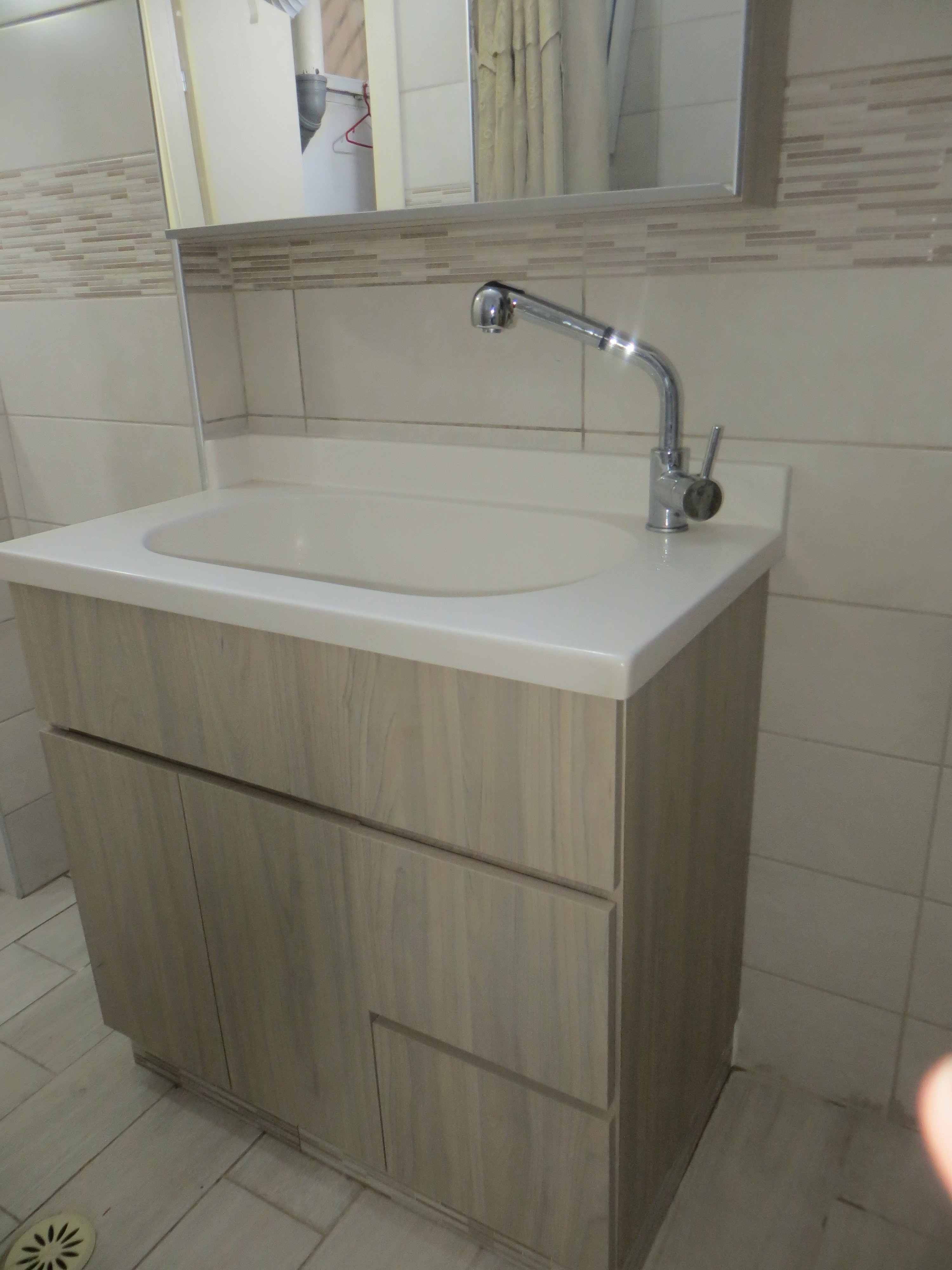 בדירה הקודמת שלי הייתי מאוד מוגבלת במיקום, בערך אותו גודל, הזמנתי ארון מנגר שהמשטח העליון שלו היה פורמייקה ומלמעלה שמנו כיור מונח גדול (היה קשה להשיג במידות האלו, קנינו בבוריס קרמיקה) יצא יפה ושימושי מאוד.