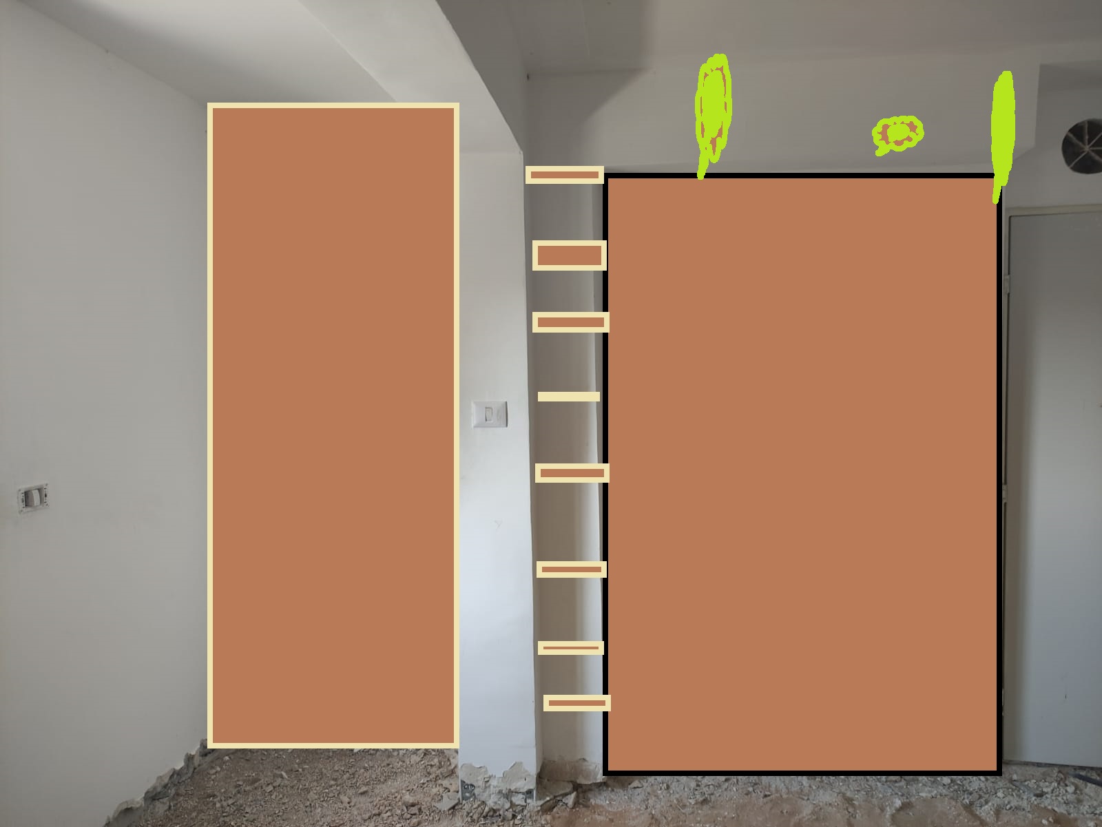 הכוונה לבליטות בקיר המסומנות בכתום כשאתם מעונינים בארון אחד שיכסה את כל השטח שסימנתי באדום ?