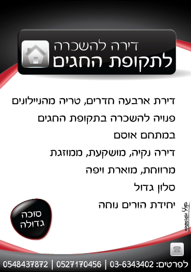 להשכרה לראש השנה, יוכ&quot;פ ושמחת תורה