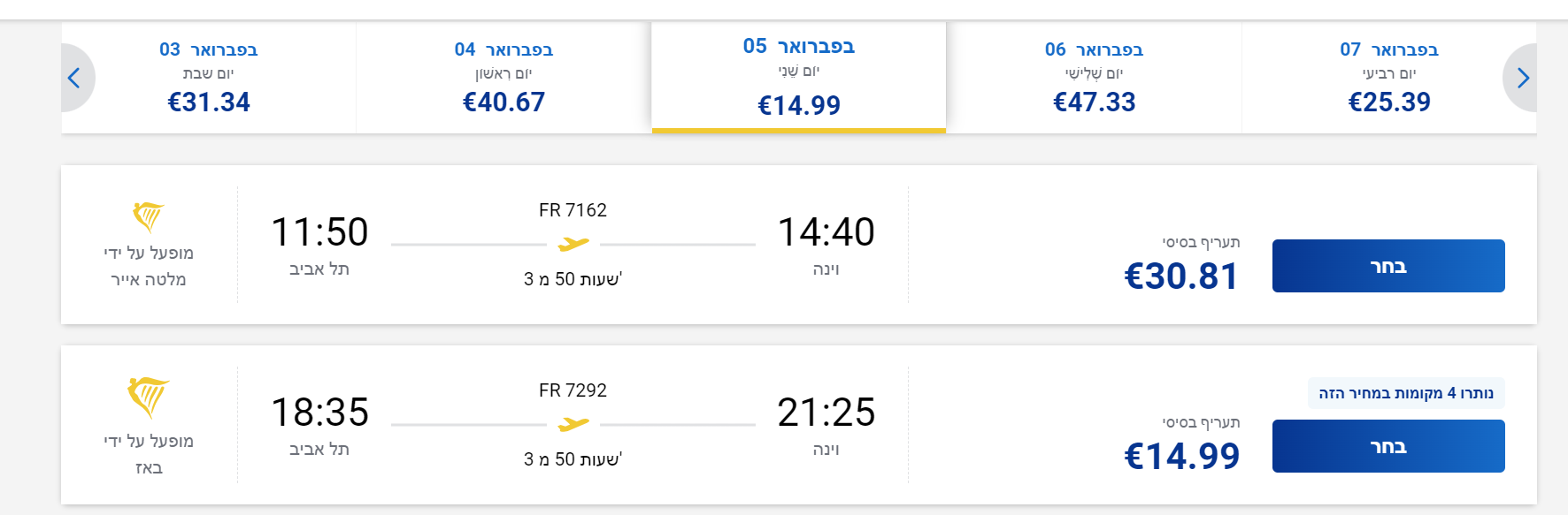 לכל מיני יעדים למשל טיסה ב5 בפברואר לוינה טיסת ערב 14.99 יורו