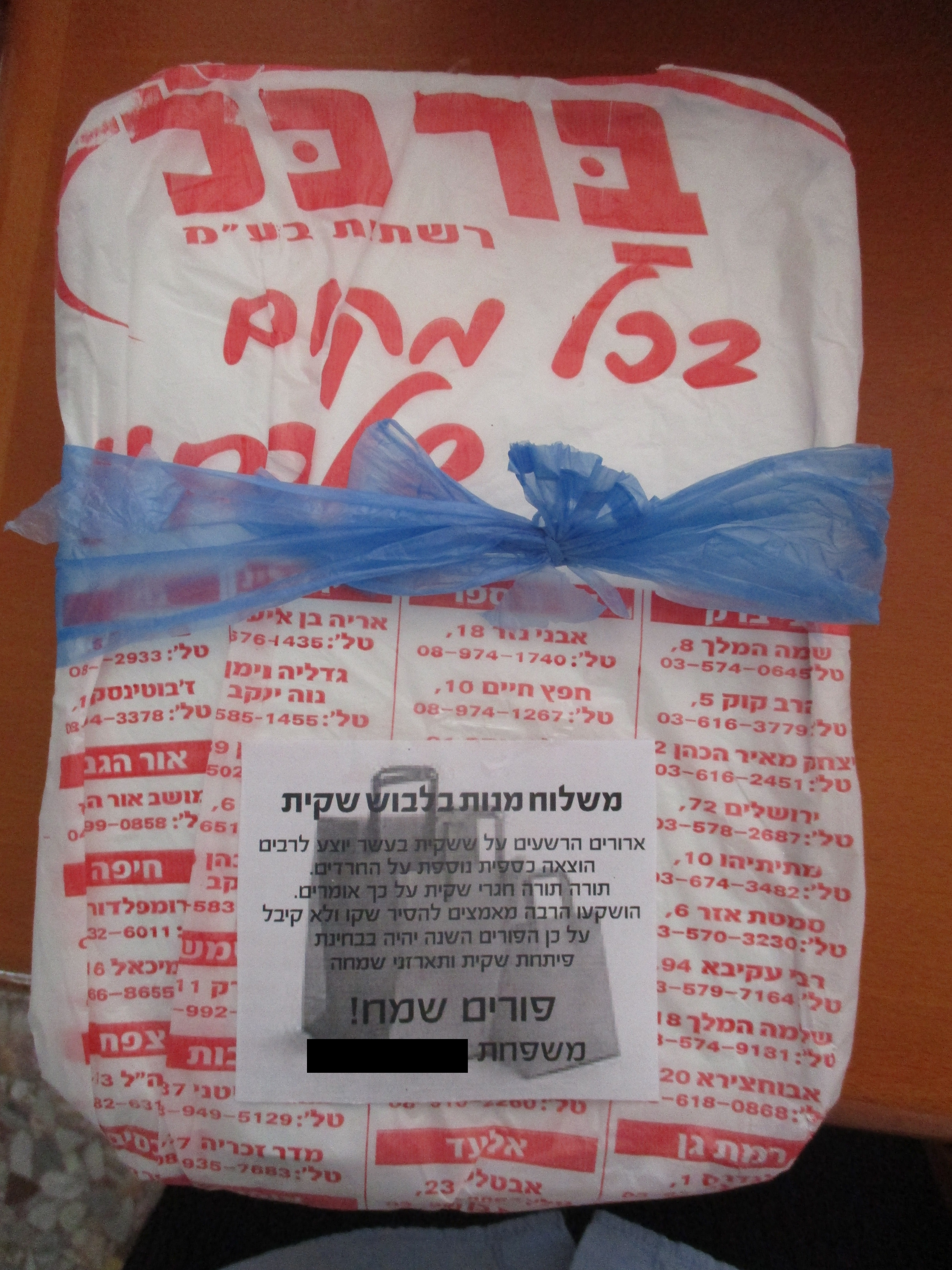 תבנית חד פעמית סגורה עם המשלוח בפנים עטופה בשקית ברכל...:)