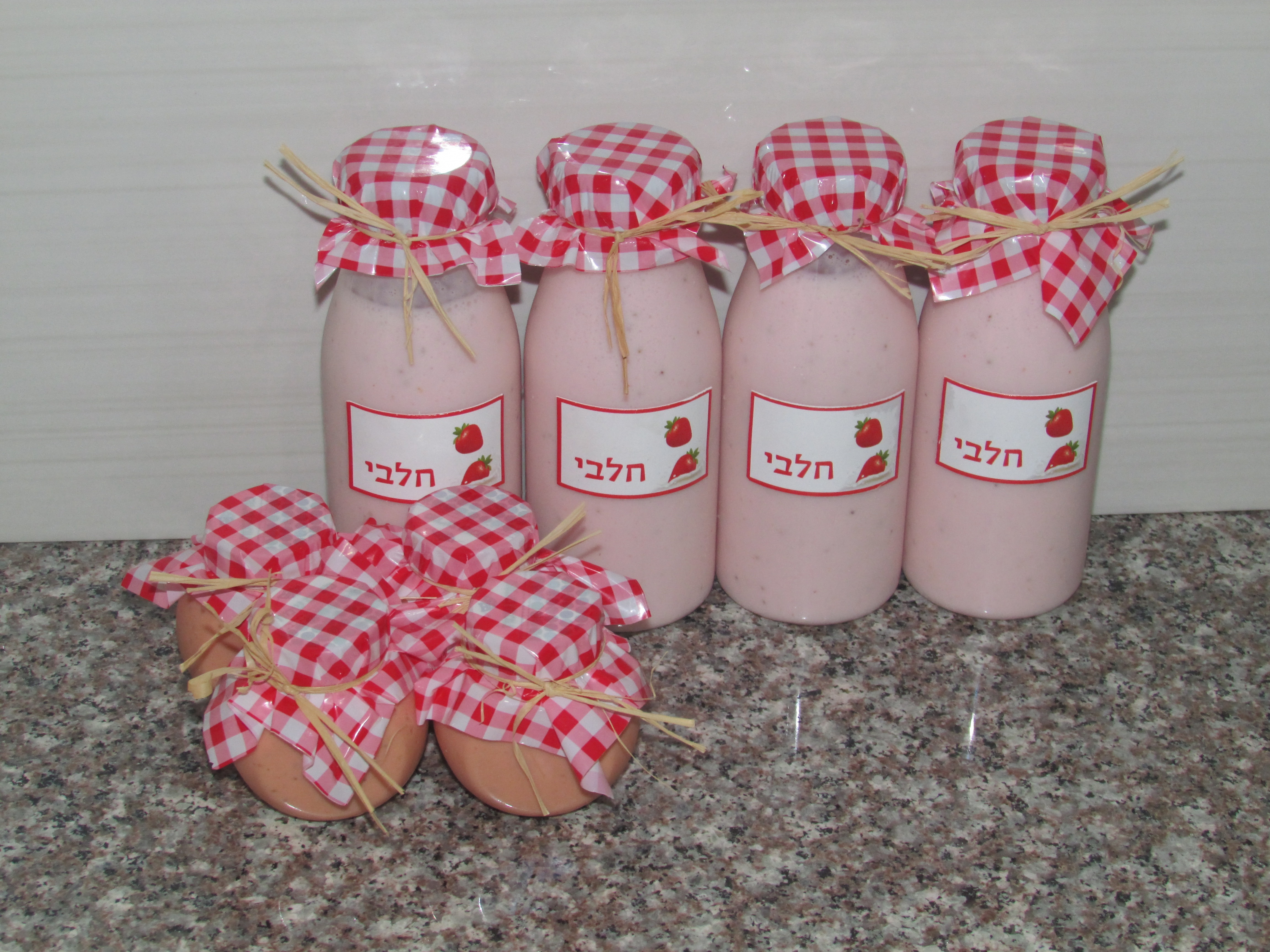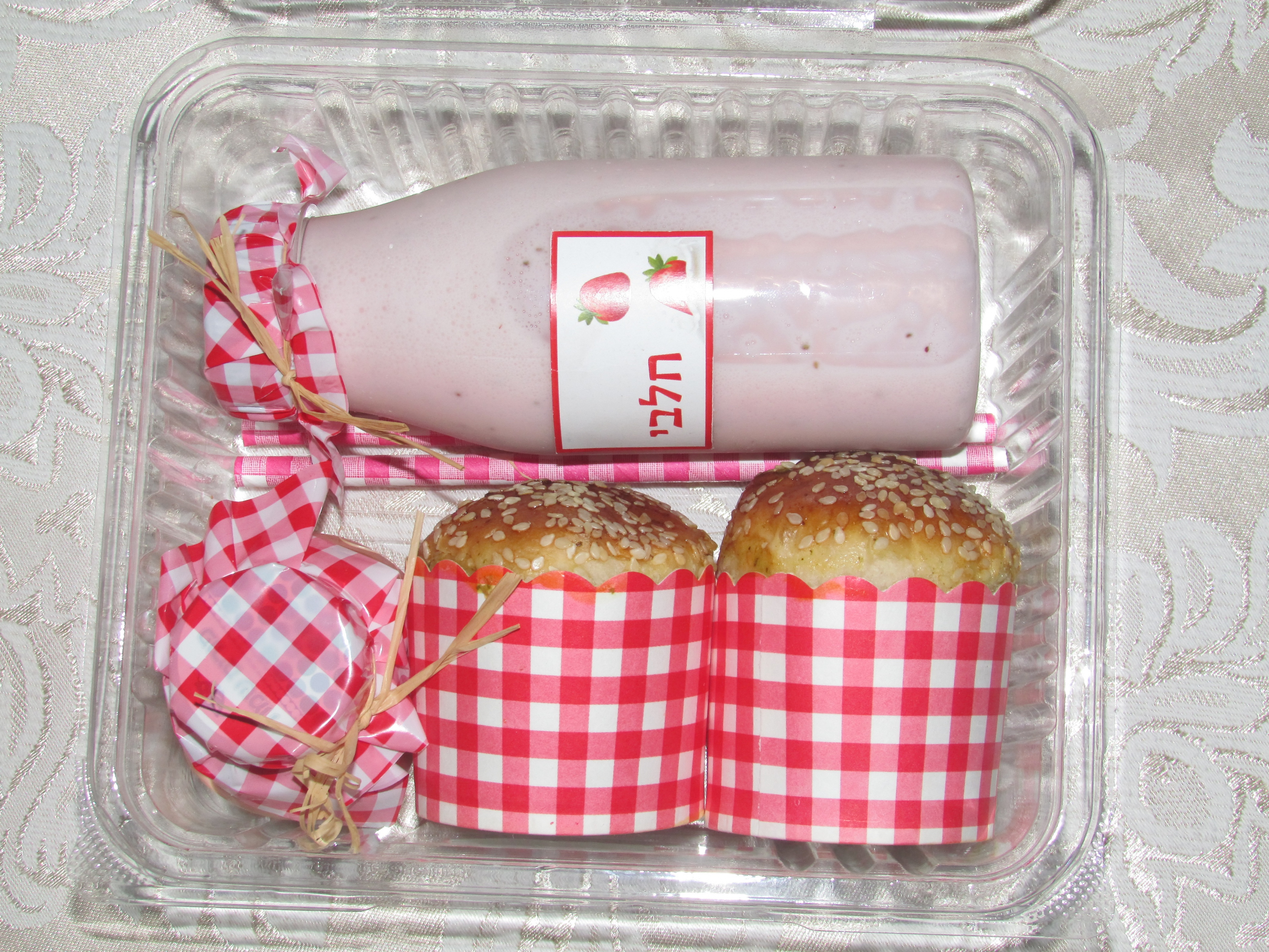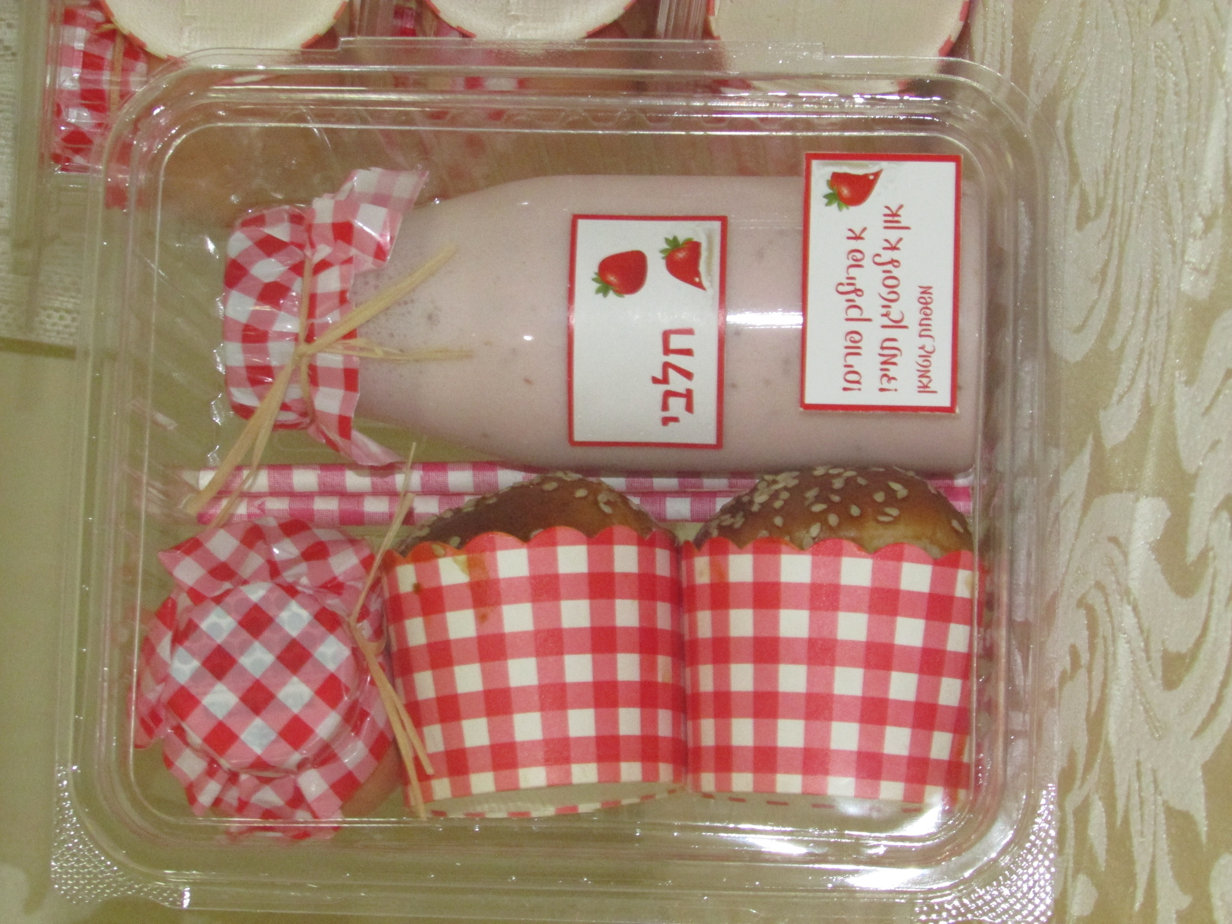 משקה מילקשייק תותים חלבי. +2 קשים עם דוגמא משובץ אדום לבן.