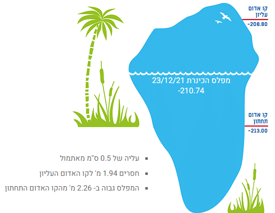 הגשמים הרבים שירדו בסערה כרמל תרמו לעלייה של מפלס הכנרת בחצי סנטימטר. המפלס עומד כעת על 210.74-, מרחק של 1.94 מטרים מהקו העליון
