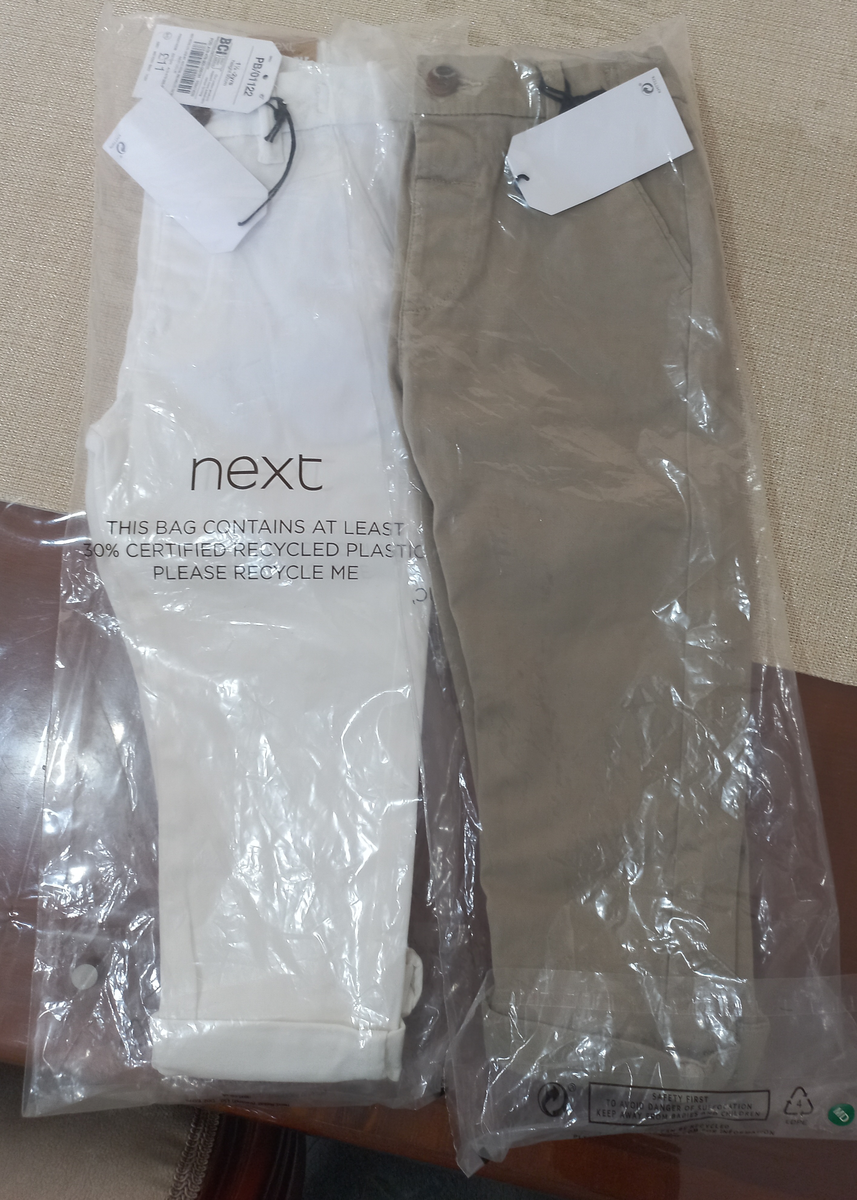 2 זוגות מכנסיים של נקסט חדשות מהניילון צבעים לבן ואבן מידה 1.5- 2 מוכרת כל אחד ב 40 ₪ כי גדול מדיי על הבן שלי.