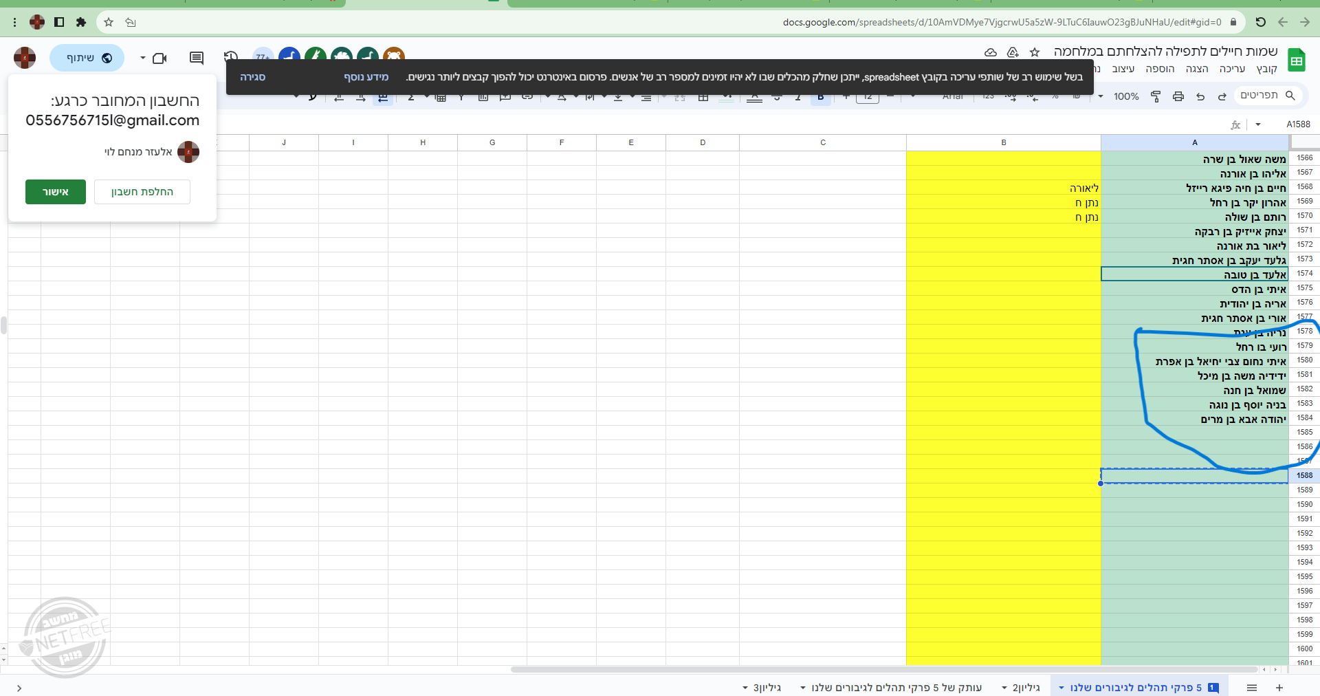רשימת בני דודים שלי לתפילה שגויסו חלקם לצפון וחלקם לדרום: