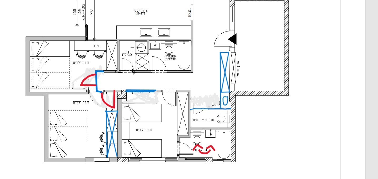 מצ"ב אופציה שחוסכת את זה. בנוסף, הייתי ממליצה להחליף בין השירותים לכיור ביחידת הורים. לא מומלץ שכיור יהיה צמוד לאמבטיה, כיוון שהרטיבות הורסת אותו.