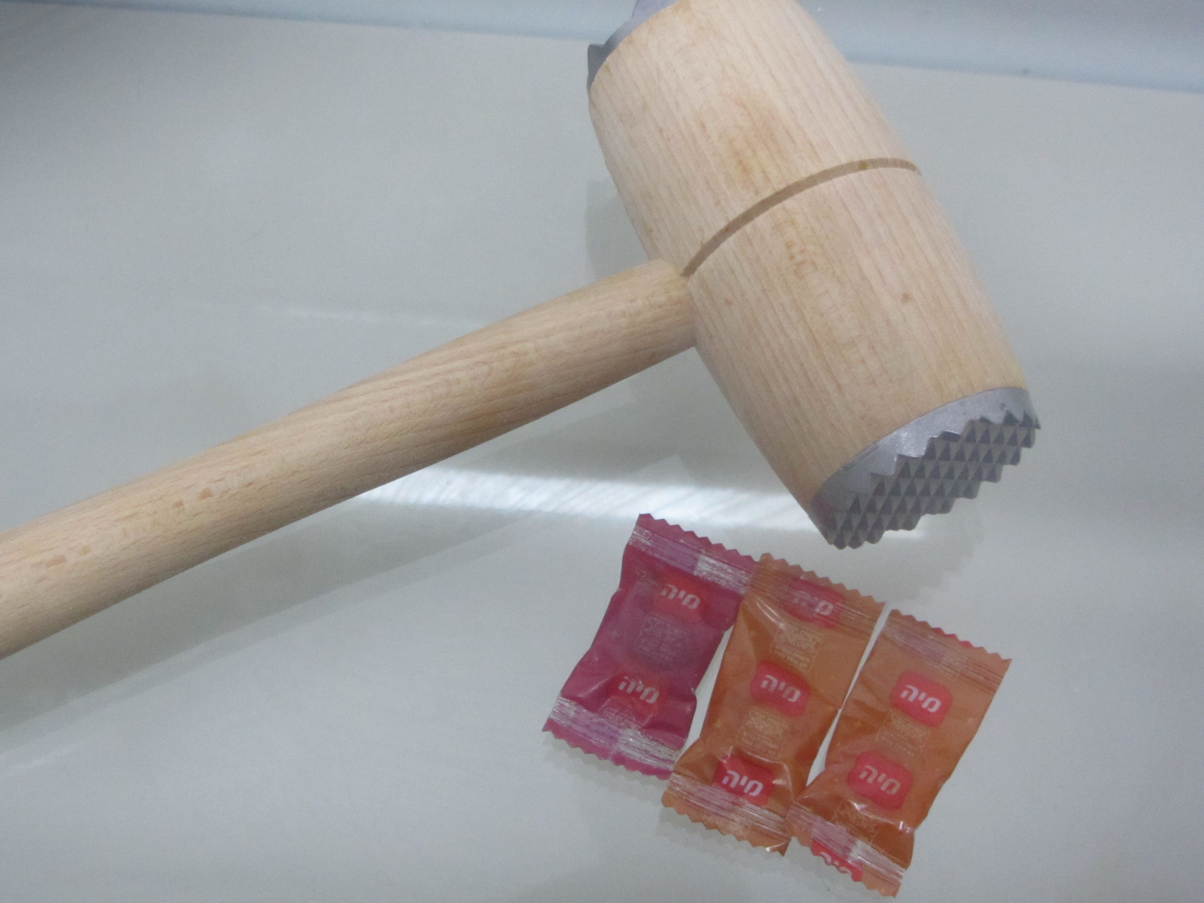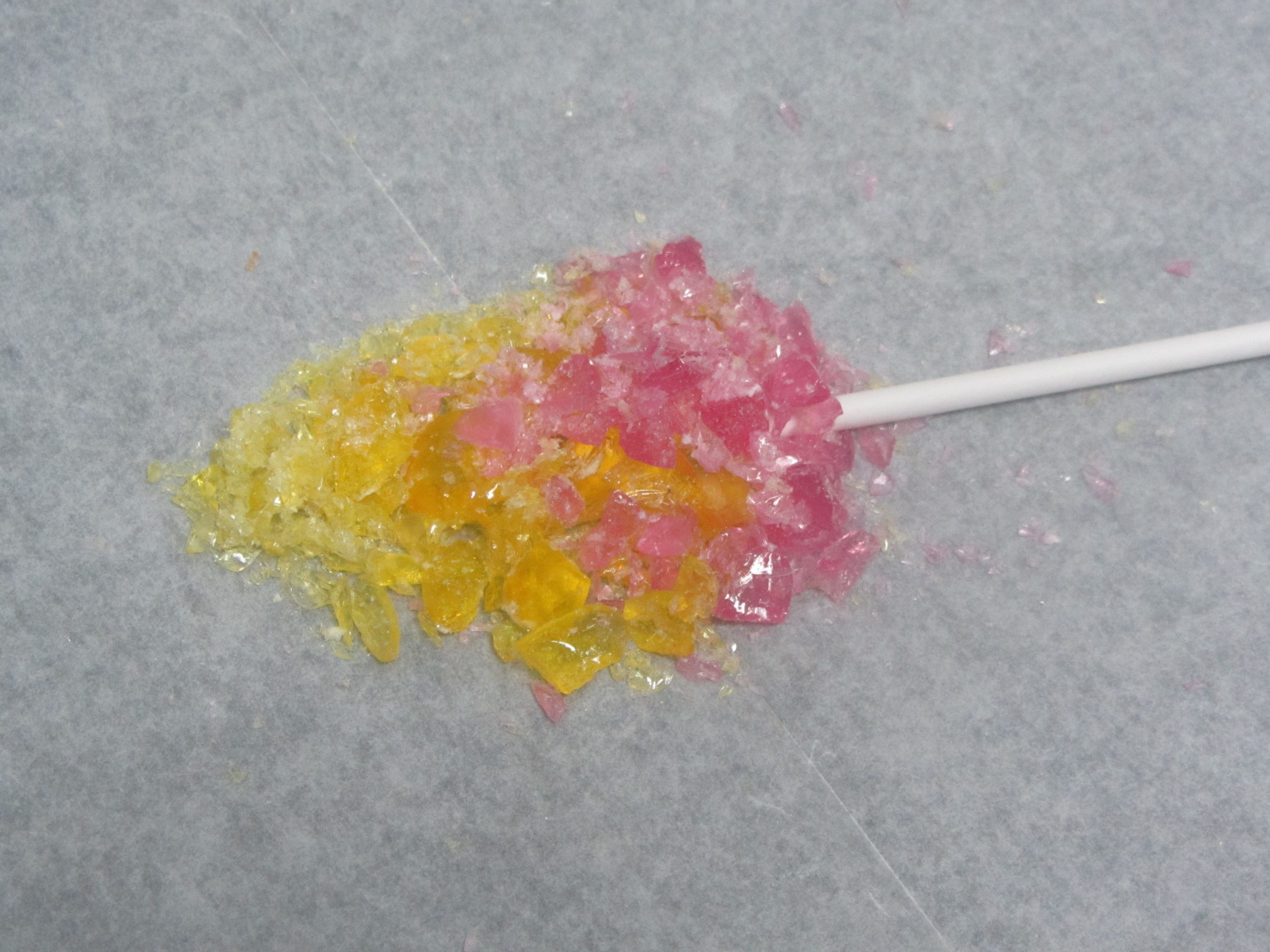 1. בעזרת פטיש שניצלים, כותשים בשקית סוכריות קשות בגוונים המתאימים. אני ריסקתי לכל סוכריה - 2 צהובות ו-1 אדומה: