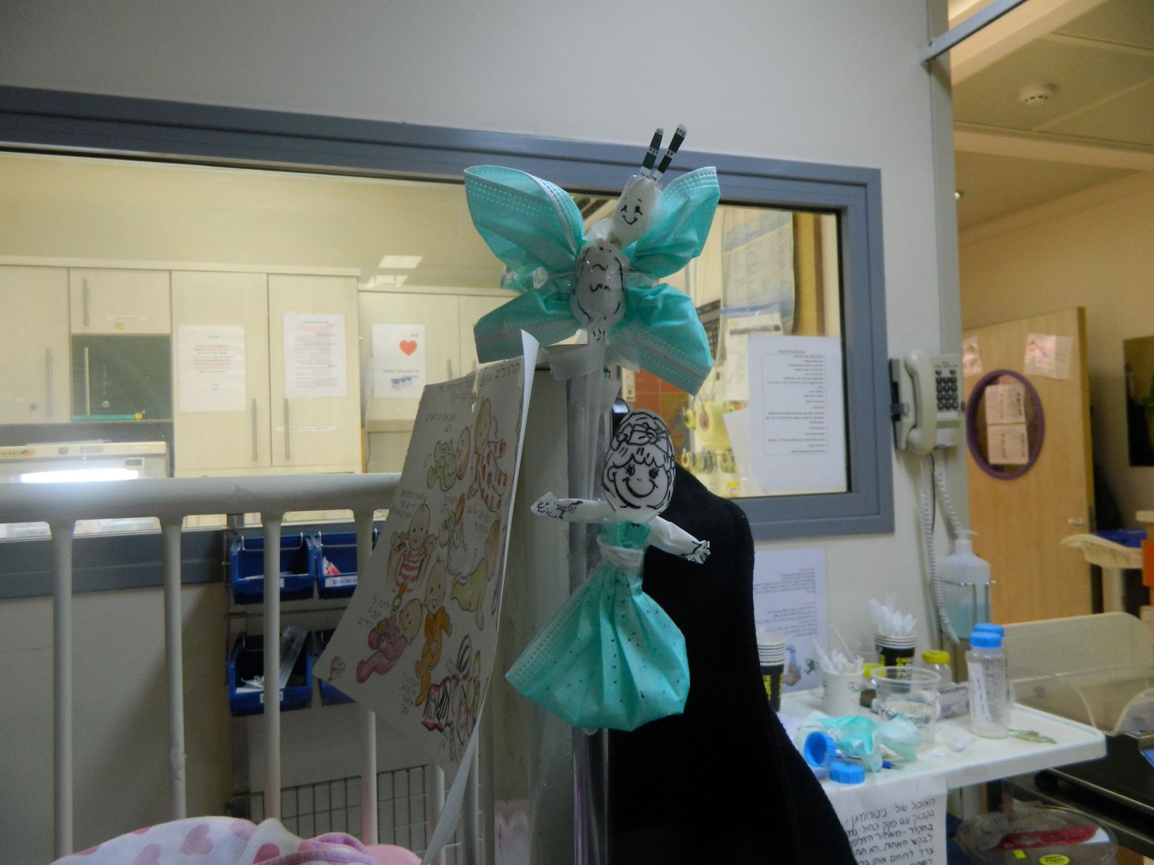 לאור המצב המעניין שלנו שממשיך וממשיך, וכולנו יוצאים עם מסכות על הפנים. התמונה הראשונה שהעליתי כאן - עגלה שהכנתי ממסכות הירוקות. מספרת שוב, התינוקת שלי הייתה בבית חולים באישפוז במשך חודש וחצי!!! ולא קורונה , אדנו וירוס, אבל הוא עשה סיבוך נשימתי כי היא ת. דאון. בקיצור חודש וחצי אישפוז, אחר כך חודש עם חמצן ביתי, ב''ה הכל הסטוריה, אבל כשהיינו באישפוז רק התחילו שמועות רחוקות מסין על הנגיף קורונה, והמסכות הירוקות , כפפות, חלוקים ח''פ מילאו את מחלקת הילדים בכמויות חופשי חודשי. הייתי מביאה אותם מתנות לילדים שלי, עד היום אנחנו משתמשים במסכות האלה שעוד נשמרו באוצרות שלהם. אבל בבית חולים אני הייתי מכינה מהם כל מיני דברים וקישטתי את המיטה וקירות בחדרון שלנו. ניפחתי כפפות והכנתי גם הרבה ציורים, הנחיות למתנדבים - אבל זה לא היה יצירה, רק ציורים, לכן לא מעלה כאן. בקיצור כולם התלהבו, קיבלנו המון יחס , התחברנו עם כל הצוות. מעלה כאן את היצירות מהמסכות - בתקווה שמהר נצא מהקורונה וכל המסכות יהיו לחומר ליצירה. יש כאן פרפר ממסכות, המיחושים - מד חומים חד פעמיים, וכפית. בובה - מסכה וכפית, הידיים - שקית סוכר. (כל הדברים החינמיים של בית חולים). הDSCN9866.JPG