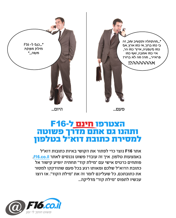 כנסו לאתר F-16 והרשמו (זה קל ולוקח רק כמה שניות) ותראו איזה חיים קלים יהיו לכם מהיום.<O:p</O:p