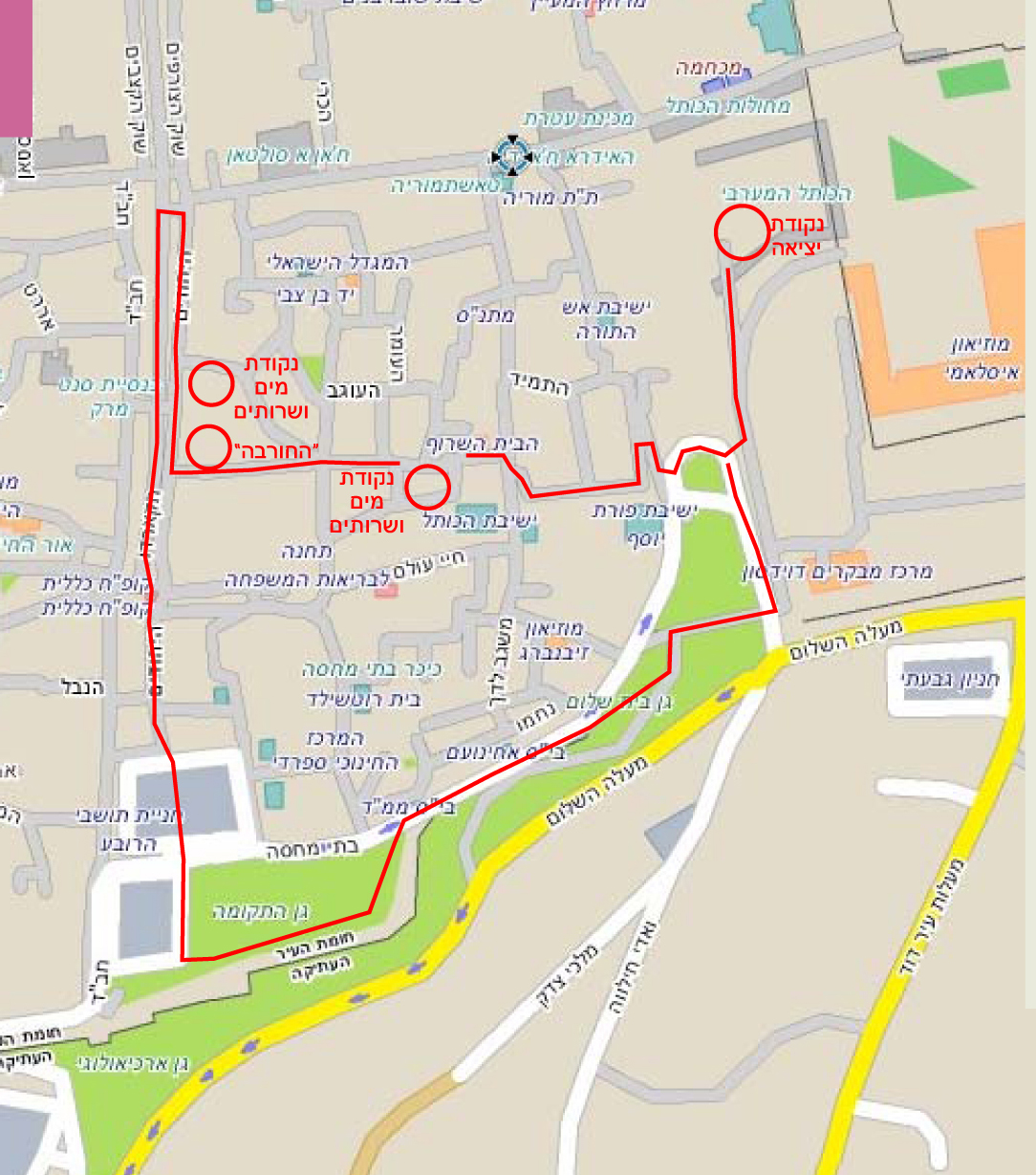 אנו יצאנו לטיול ברובע ביום העצמאות עם ילדים בני 5, 3 ושנה, והיה מוצלח ביותר! נקודת היציאה מרחבת הכותל – גם זו חוויה לילדים שלא הזדמן להם לבקר בו קודם לכן. מרחבת הכותל עולים במדרגות (מעלות רבי יהודה הלוי). יש אזור מקורה ובו מס' חנויות מזון. שם יש גם נקודת מים ושרותים, ומקום מוצל לשבת. ממשיכים ישר ברח' __________ לכיוון כיכר ביהכנ"ס "החורבה" בית הכנסת נפתח לסיורים בתאום מראש בלבד, או לחילופין בזמני התפילות – מנחה קרוב לשקיעה, מעריב בזמן. מכיכר החורבה פונים ימינה אל רח' היהודים, והולכים בו עד קרוב לסוף , שימו לב גם שם , באחת הפניות ימינה ישנה נקודת מים ושרותים. יש שילוט. בסוף רח' היהודים ישנה הכניסה לשוק הערבי, ואנו כמובן לא נכנסים בה. כמה מטרים לפני הכניסה לשוק נראה מדרגות היורדות לכיוון שמאל, אל הקרדו התת קרקעי. נרד במדרגות ונפנה שמאלה, במקביל לכיוון ממנו הגענו. הקרדו עשיר בחנויות אומנות ומזכרות ממוזגות, ונחמד לטייל בו. בהמשך נראה ציור קיר גדול, המשחזר את הקרדו בפעילותו בתקופה הרומי, ונוכל לראות עמודים ששרדו כמעט בשלמותם מאז. בסוף הקרדו יביאו אותנו המדרגות העולות חזרה אל רחוב היהודים. נמשיך ישר, שם נפגוש מס' חנויות פיצה – אחת מהן בכשרות הרב רובין. נחצה את חניון שער ציון, ונרד אל הגינה הצמודה לחומה – גן התקומה. בגינה ישנם מגרשים למשחק כדורגל/כדורסל, ומתקנים לילדים. בסוף הגינה, עם עלותנו לרח' בתי מחסה, מתאחד מפלס החומה עם גובה המדרכה, ובנקודה זו ניתן לעלות על החומה וללכת לאורכה עד לסוף הרחוב. להזהר לא להחליק. בסוף הרחוב מתאחדת דרכנו שוב חזרה עם הכניסה לרחבת הכותל, וכאן ניתן לקחת תחבורה ציבורית בחזרה הביתה.
