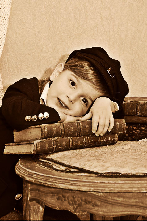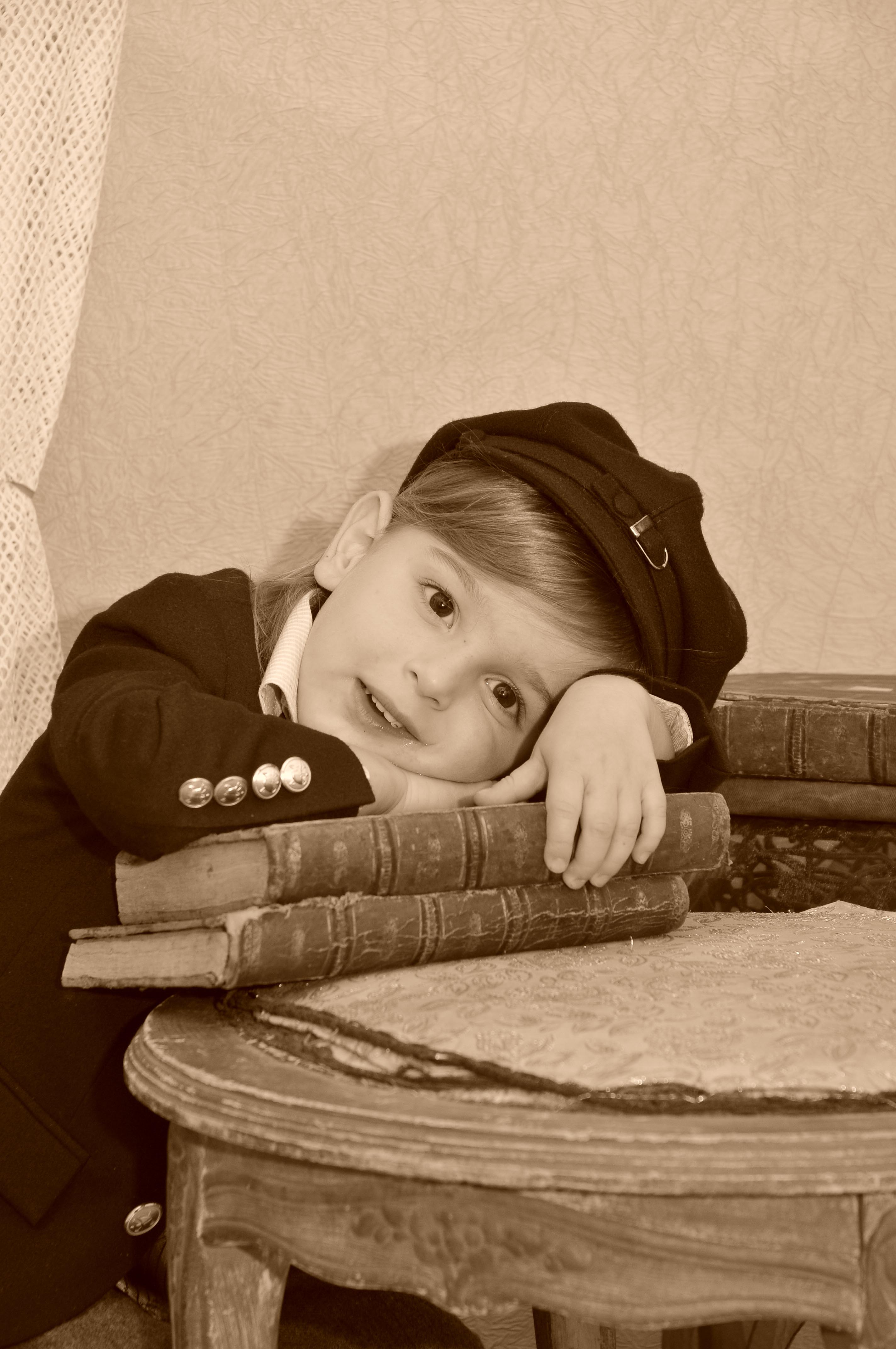 הקסקט של הילד והספרים הישנים מזכירים ילד של פעם!