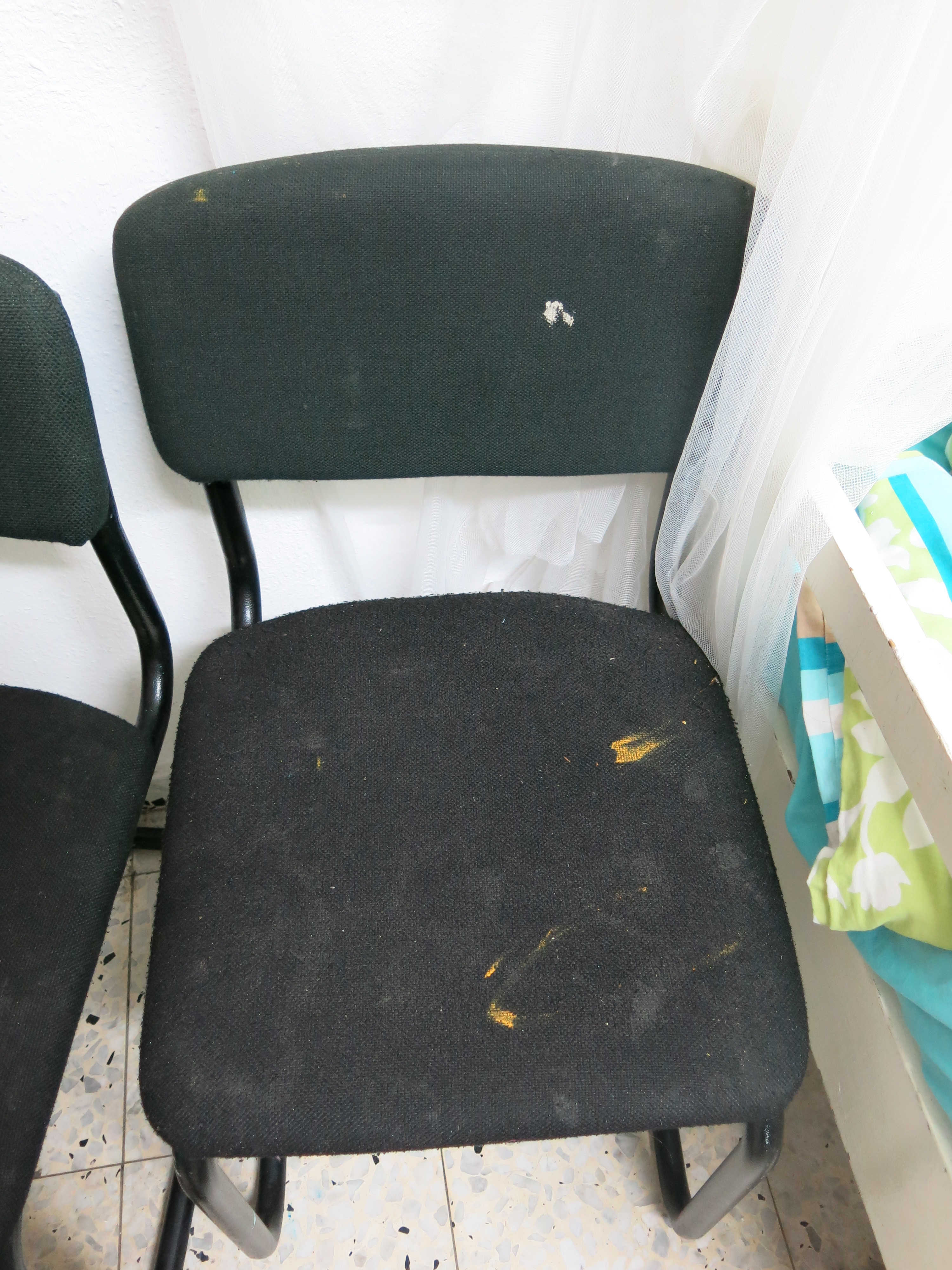 כסא טלפון ישן שהיה כבר מגורד ונראה די נורא,