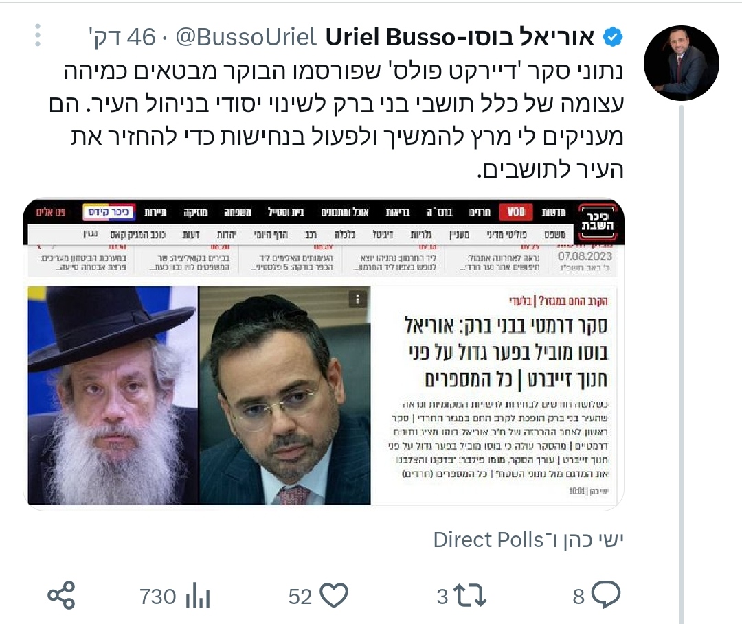 אלי ביתאן על הסקר של ב״ב שנחשף ב׳כיכר׳: ‏התמודדות בוסו בבני ברק, שהחל כמועמד מדף, הופכת להיות האירוע הפוליטי המשמעותי ביותר שידעה הפוליטיקה החרדית. אם בוסו יישאר עד לקו הסיום - זו תהיה ירייה במצח של הפוליטיקה החרדית.