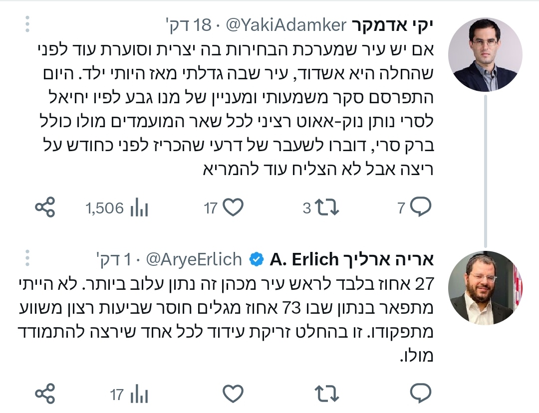 יעקב ריבלין: ‏מלחמת הסקרים באשדוד. כל מועמד מציג סקר הנוטה לטובתו. עברתי על ארבעה. המכנה המשותף לכולם הוא שלסרי עדיין על אותם עשרים ושבעה אחוז שכוללים גם את החרדים. המשמעות ברורה: אם החרדים עוזבים אותו ישראל תזכה לשגריר מצויין במרוקו.