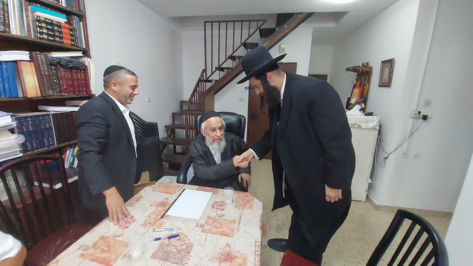 ‏המועמד לראשות העיר אלעד ישראל פרוש וסגנו ברק צברי מתברכים לאחר חתימת ההסכם באלעד, אצל מרן הגאון הגדול הרב יצחק רצאבי שליט"א מגדולי רבני תימן.