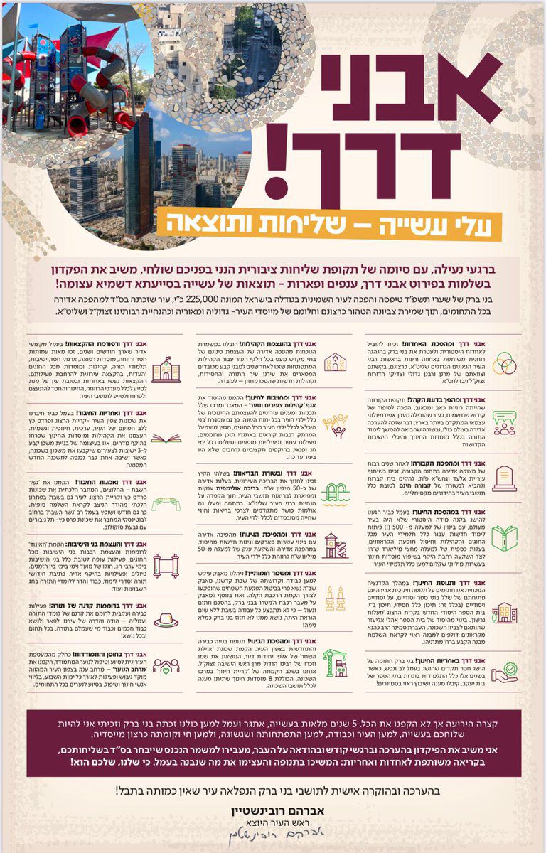 ‏"ראש העיר היוצא". ניסוח כזה עוד לא ראינו. ראש עיריית בני ברק רובינשטיין מפרסם מחר מכתב פרידה בעיתונות החרדית בו הוא מסכם את הישגי עשייתו ומוסר דין וחשבון מפורט תוך כדי תודה וברכה לשולחיו ו"החזרת הפיקדון". צעד אצילי שלא הוכר עד כה במחוזותינו.