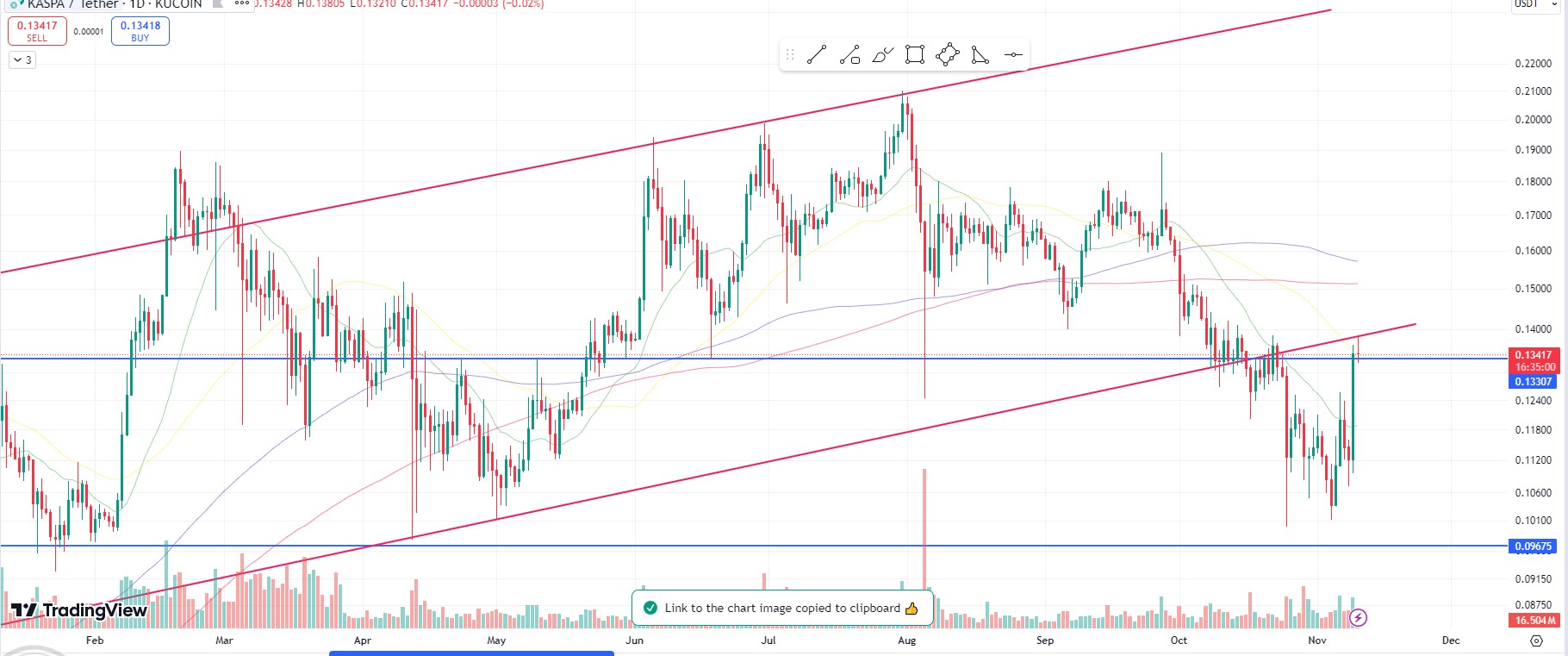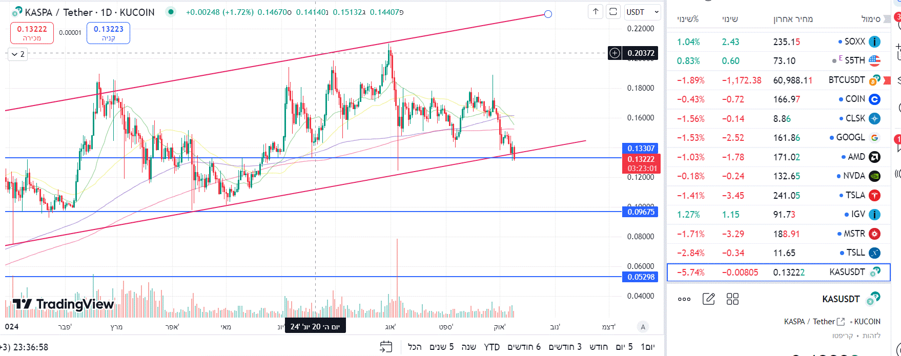 kaspa עולה ב 20 אחוז ביום . עולה עם השוק נתמך על איזור 0.1 וכעת כבר מעל 0.13 אם ייתמך עליו חזרה לשיא לא מופרך נהלו סיכונים