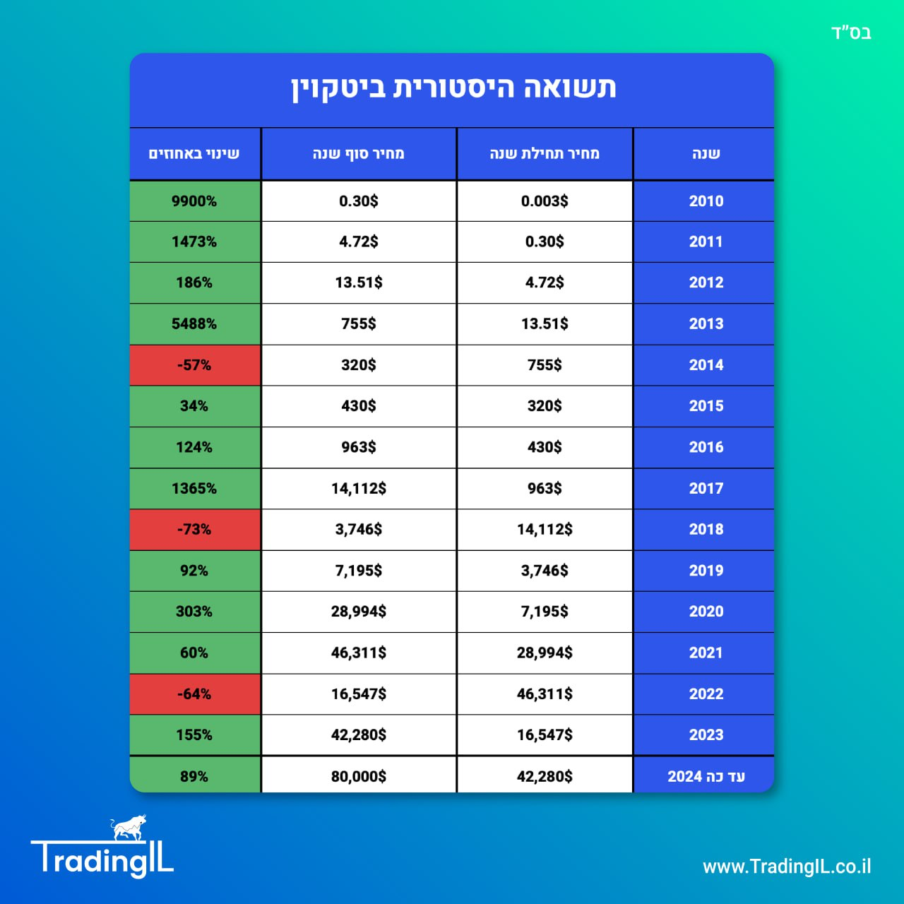 👈 מצורפת טבלה המציגה את התשואה ההיסטורית של מטבע הביטקוין לפי שנים.