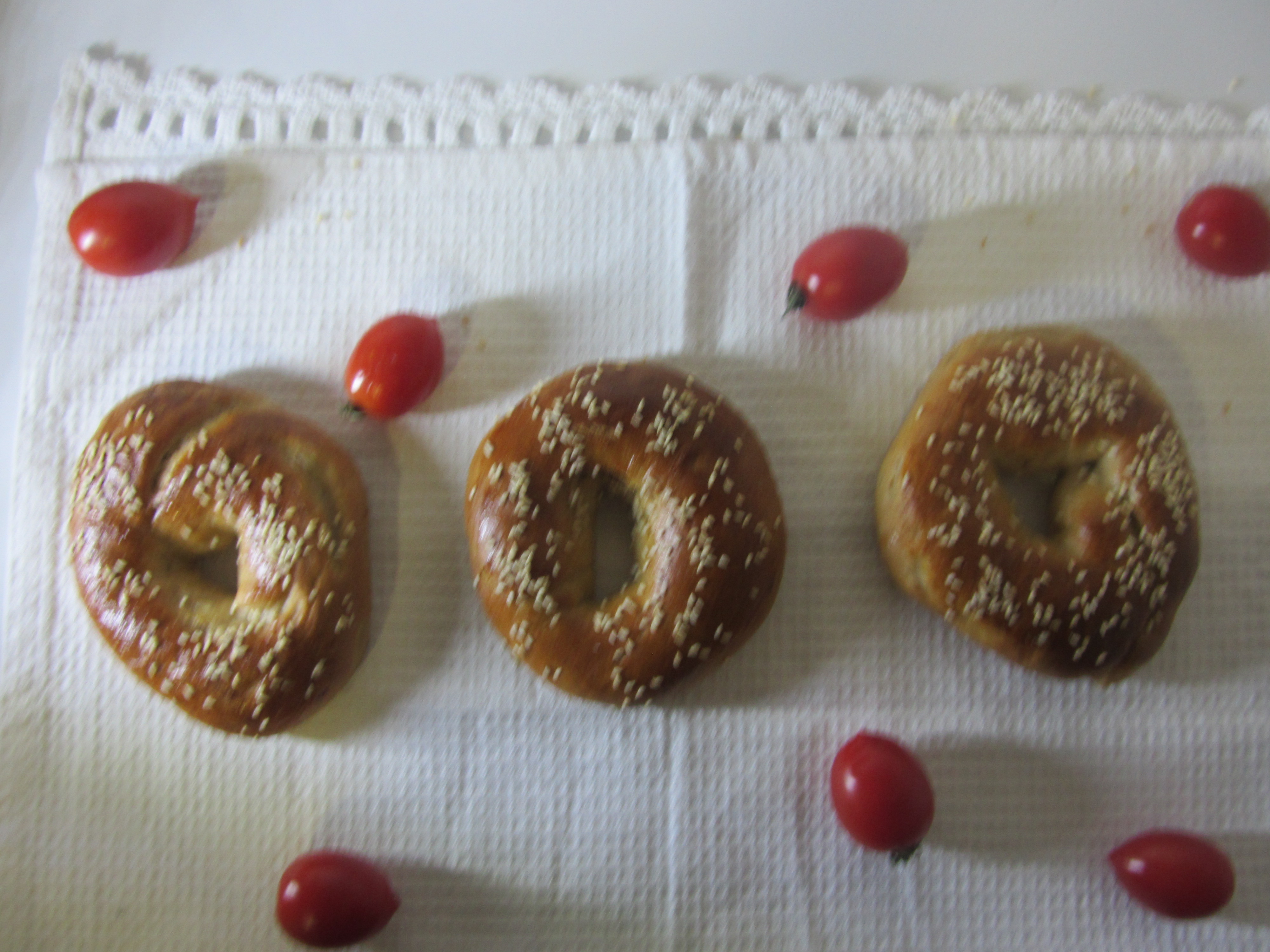 מניחים על תבנית מרופדת בניר אפיה. מורחים ביצה מהולה במים ומפזרים מלח גס, בצל מטוגן, שום גבישי, פרג, שומשום וכו', מה שרוצים ומעבירים לתנור.