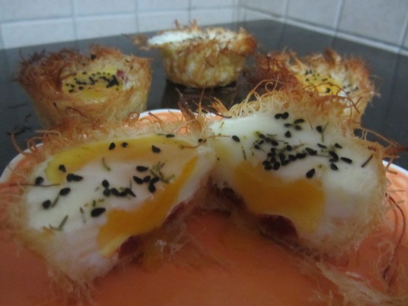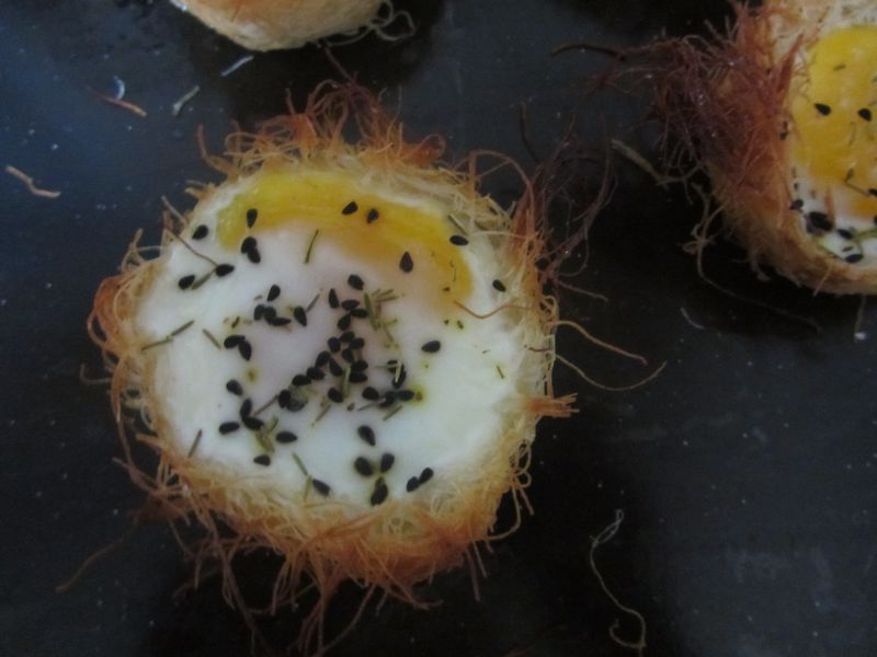 שלחתי לתנור ל-15 דקות להשחמה של הקדאיף ואפיה של הביצה.