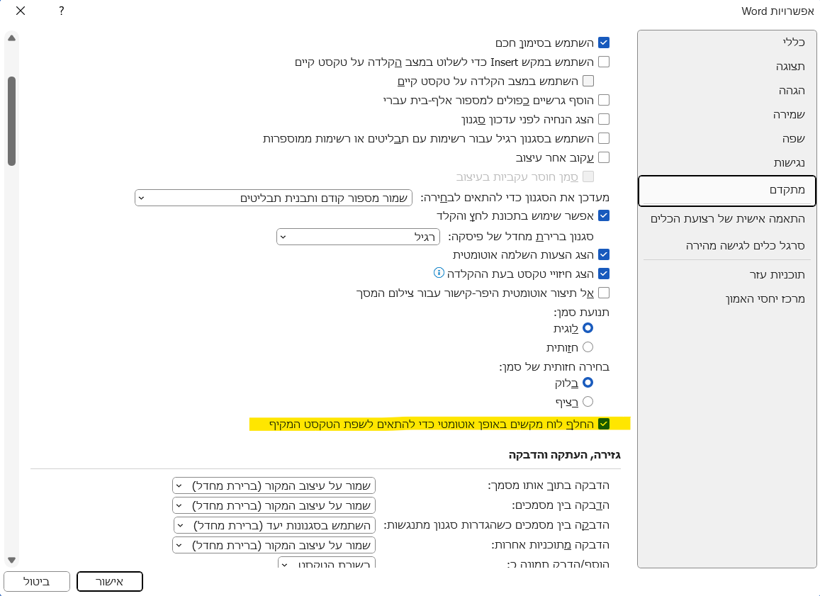 אופיס 365 במעבר פיסקה חדשה אוטומטי מחליף לשפת אנגלית