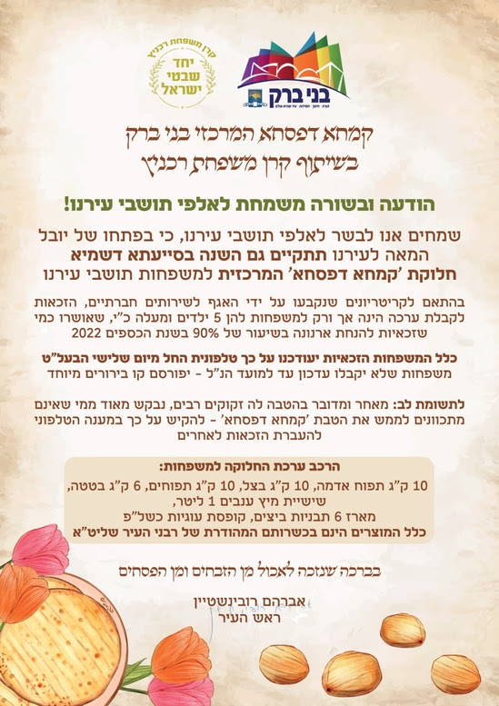 אני רואה חלוקות על גבי חלוקות של כל הדברים הכי שווים שיכולים לסדר משפחה לפסח שלם וכל השכנים מסביב רק רצים מחלוקה לחלוקה, ובכל מקום אומרים לי שהייתי צריך להירשם מראש או שזה רק לאנשים ומשפחות מסויימות ( יש לציין שכל השכנים בבניין שלנו כלולים ב"משפחות מסויימות").