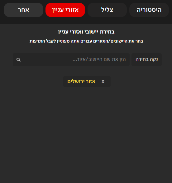 יש אופציה לאזורי עניין שם רושמים את שם היישוב בו מעוניינים לקבל התרעה