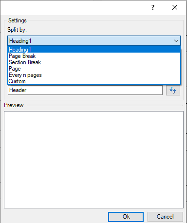 מצורף צילום מסך של אפשרויות הפיצול השונות (לפי סגנון, מעבר עמוד, מעבר מקטע, עמוד, כל X עמודים, מותאם אישית).