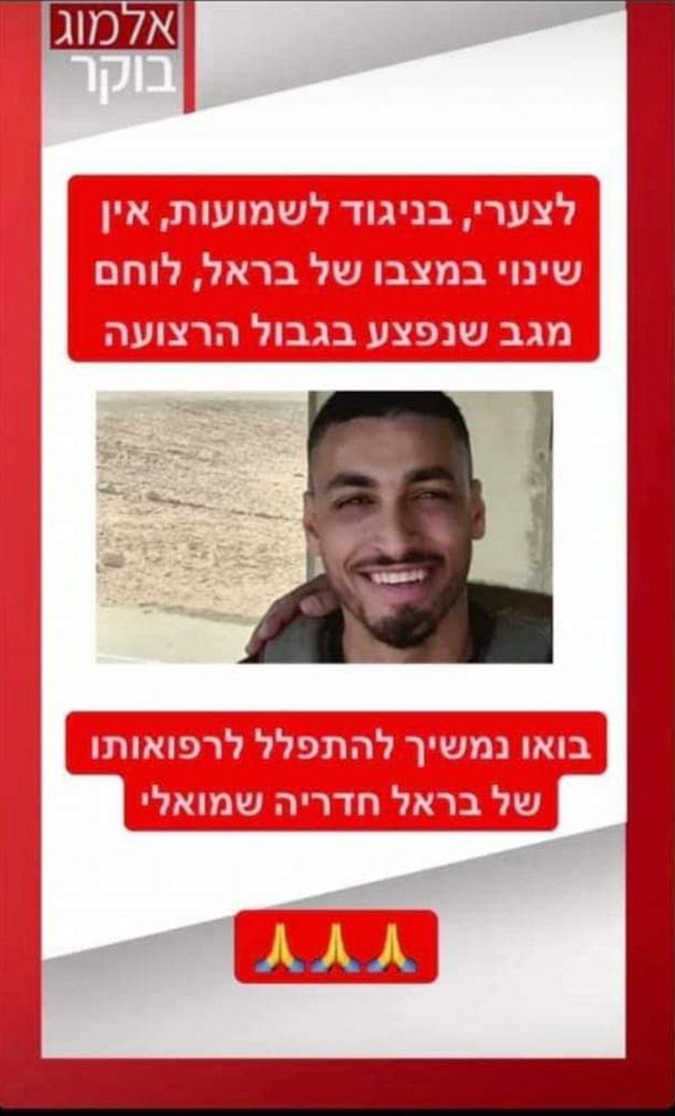 למעלה משבוע שלוחם משמר הגבול, בראל אחיה חדריה שמואלי, מאושפז בבית החולים סורוקה בבאר שבע והרופאים נאבקים על חייו | היום חלה החמרה משמעותית במצבו | בני משפחתו שוהים בסמוך למיטתו בבית החולים