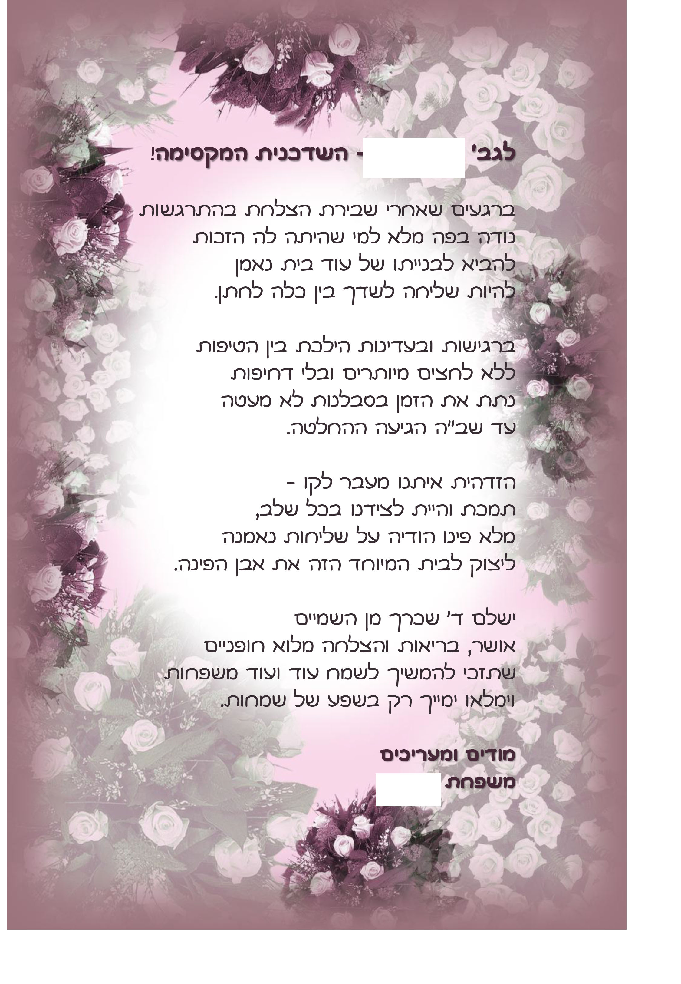 אשמח מאוד לקבל דוגמא לברכה לרבה ולמטפלת לטו בשבט
