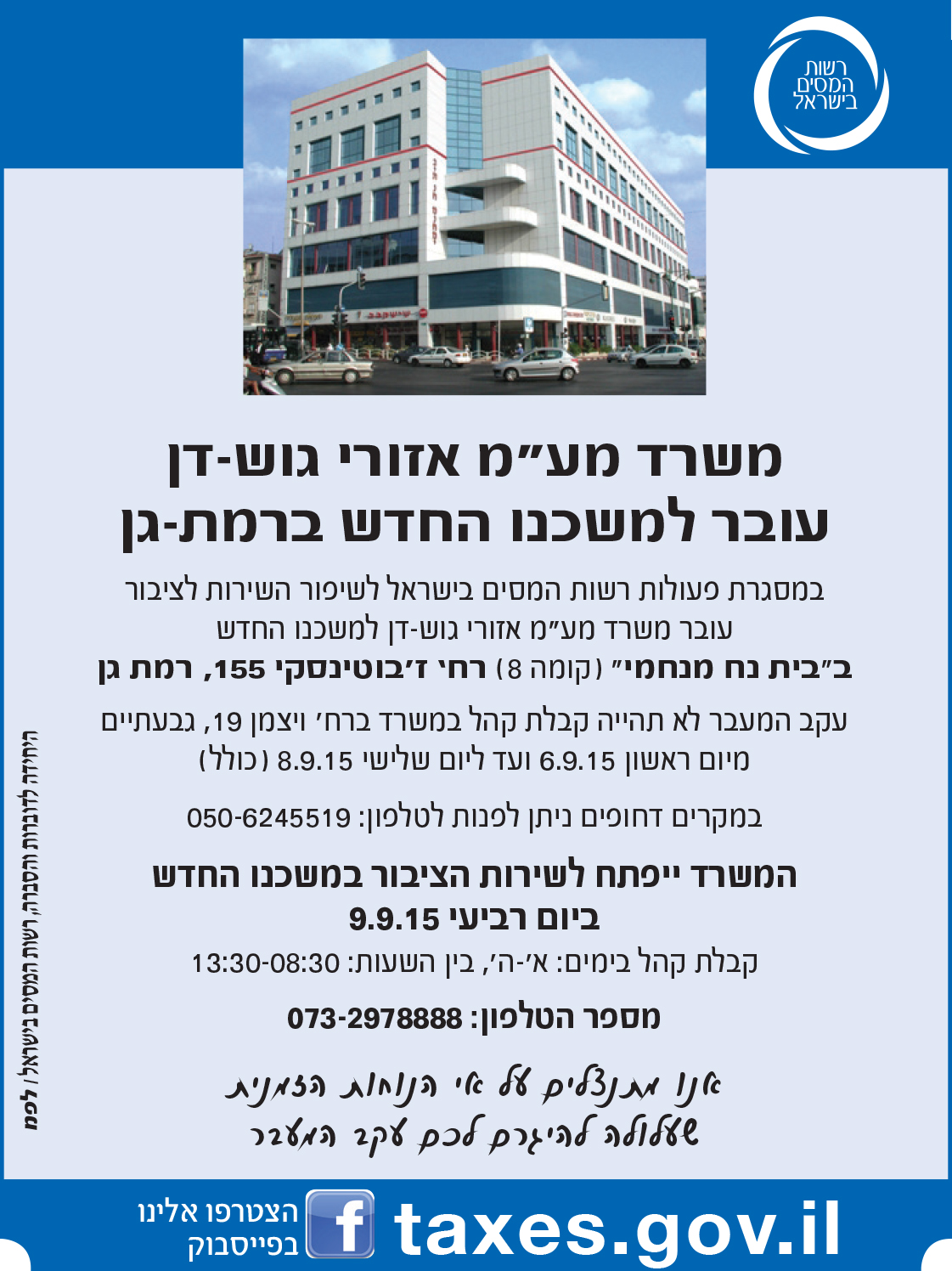 משרד מע"מ גוש דן - עובר ל"בית נח מנחמי" רח' ז'בוטינסקי 155, רמת גן