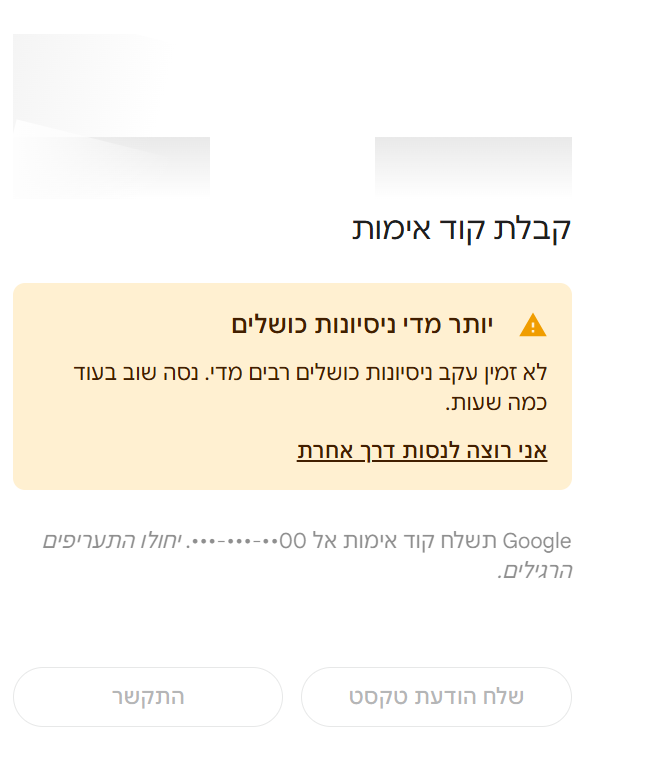 שכחתי את סיסמת חשבון הגוגל שלי וניסיתי מספר פעמים להיכנס. לאחר שנזכרתי בסיסמה הנכונה, גוגל ביקשה לאמת את זהותי באמצעות שיחת טלפון או SMS. בחרתי בשיחה טלפונית, אך גוגל מציגה הודעה שהיא לא מצליחה להתקשר. כעת, לאחר מספר ניסיונות כושלים, החשבון נחסם זמנית.