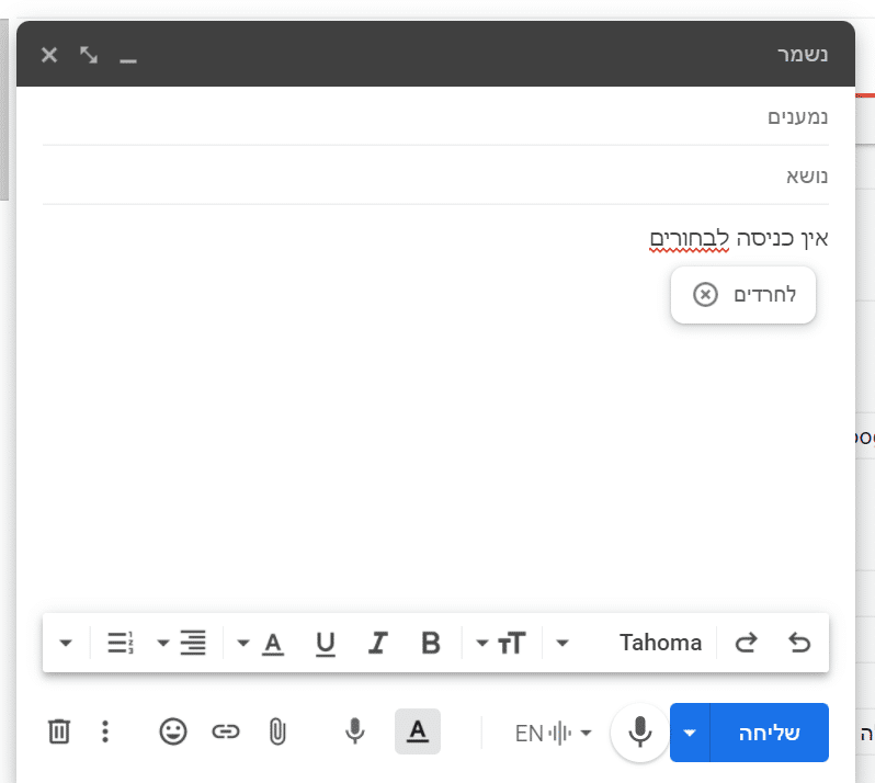 כתבתי במייל "אין כניסה לבחורים" וזה עשה שיש שגיאה וזה אמור להיות לחרדים!