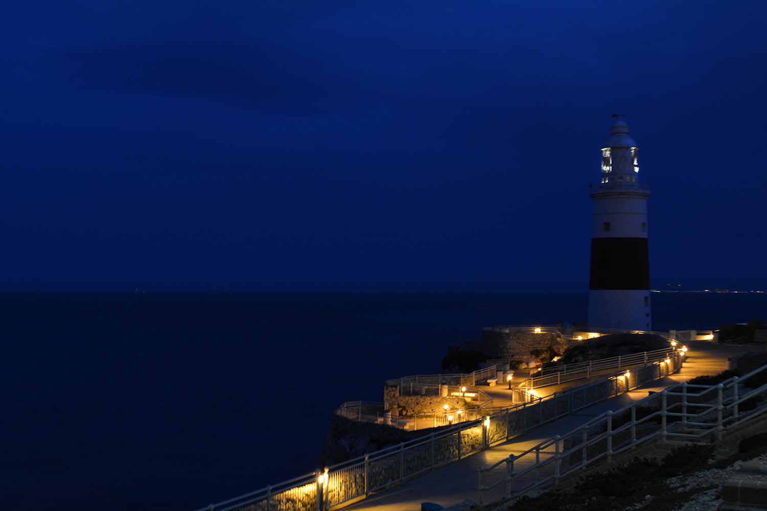 המגדלור באירופה פוינט - הקצה הדרומי של גיברלטר. רחוק ברקע בצד ימין ניתן להבחין באורות של אפריקה.
