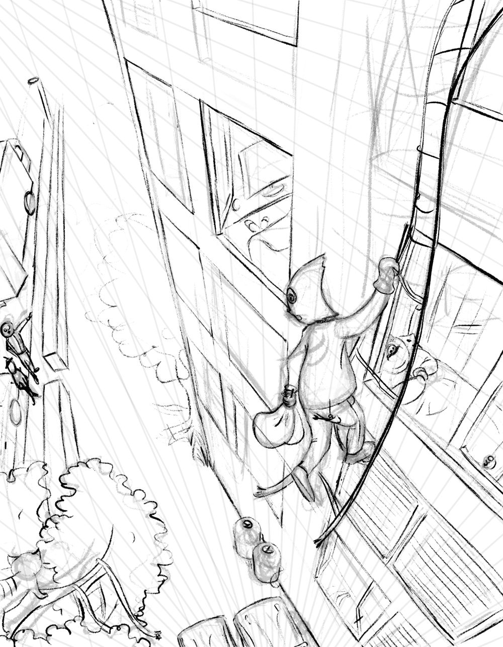 הסצנה שלנו מתרחשת בלילה, מה שאומר שכנראה שתאורת הסביבה שלנו היא כחולה. לכן כל הגוונים בציור אמורים לנטות קצת לכיוון הקר של הספקטרום. וכמובן, הגנב מקבל גוון ייחודי משלו כדי לעזור לצופה החביב להתמקד: )