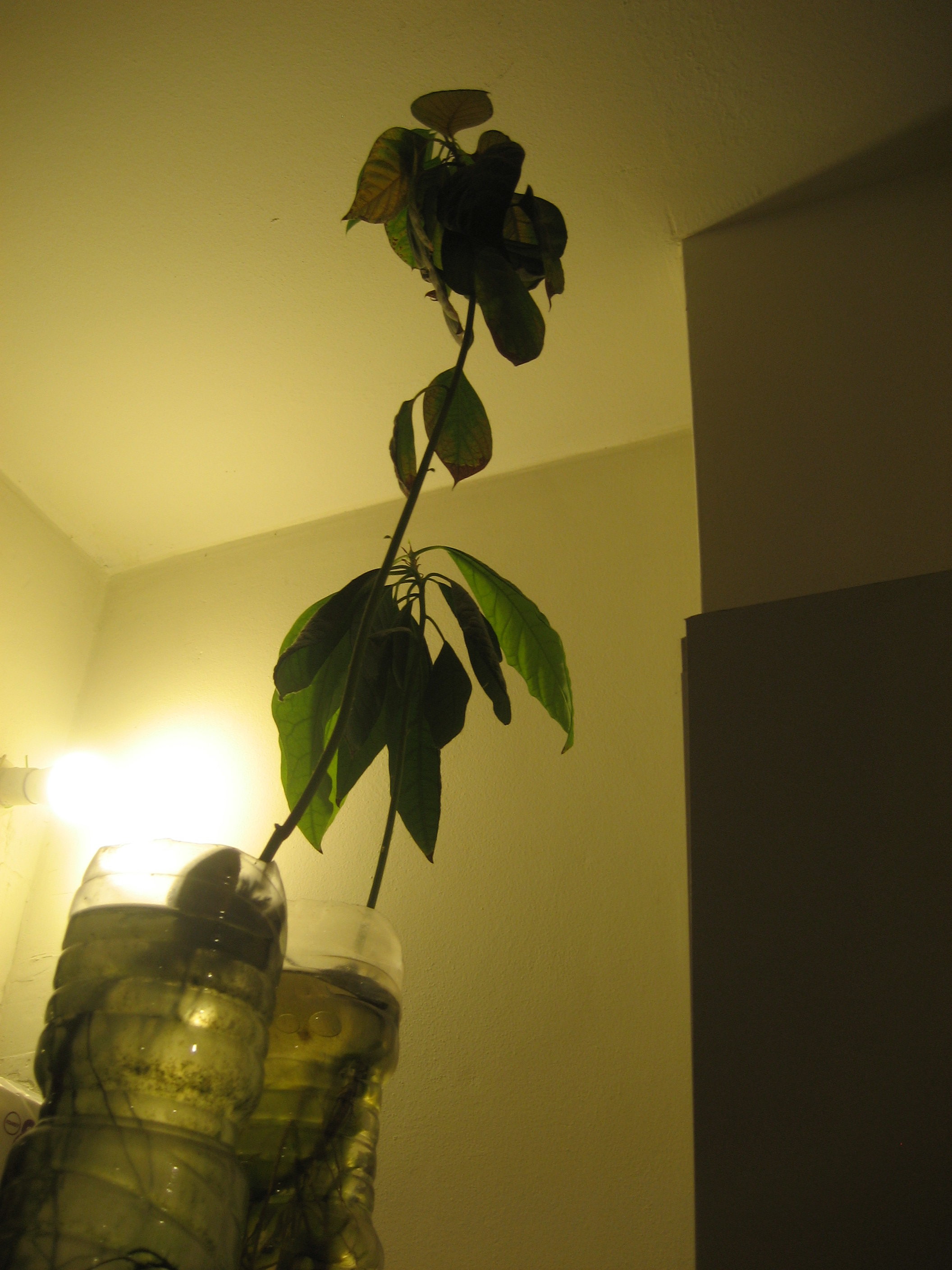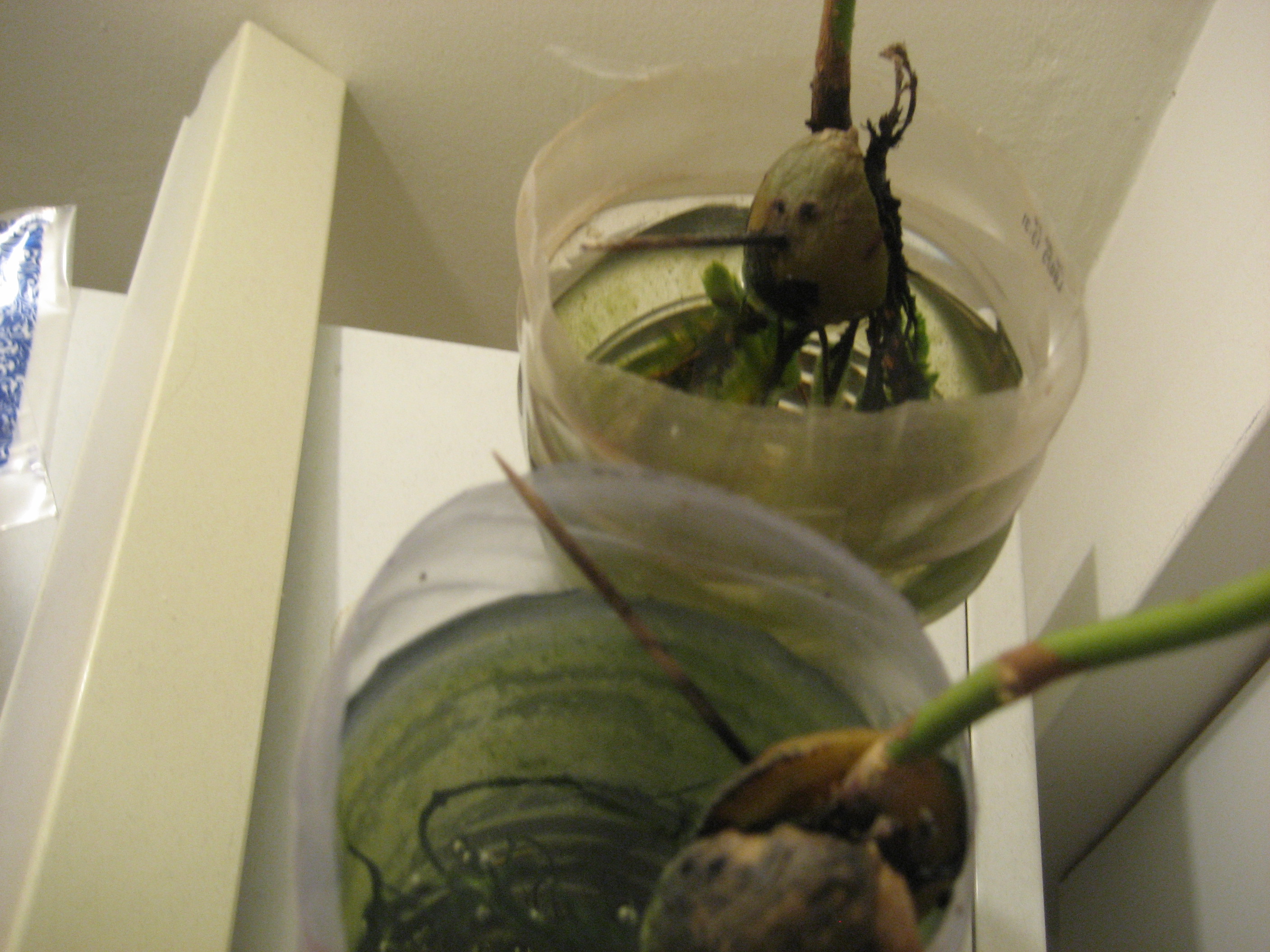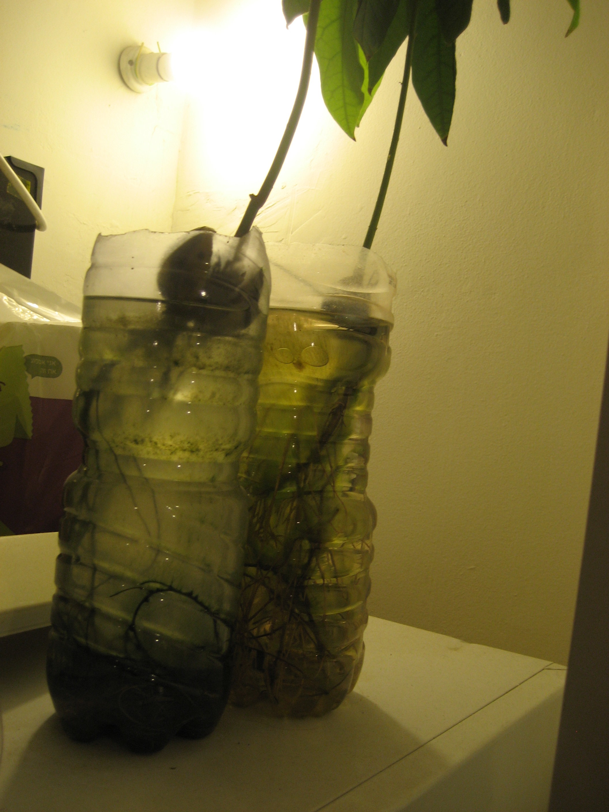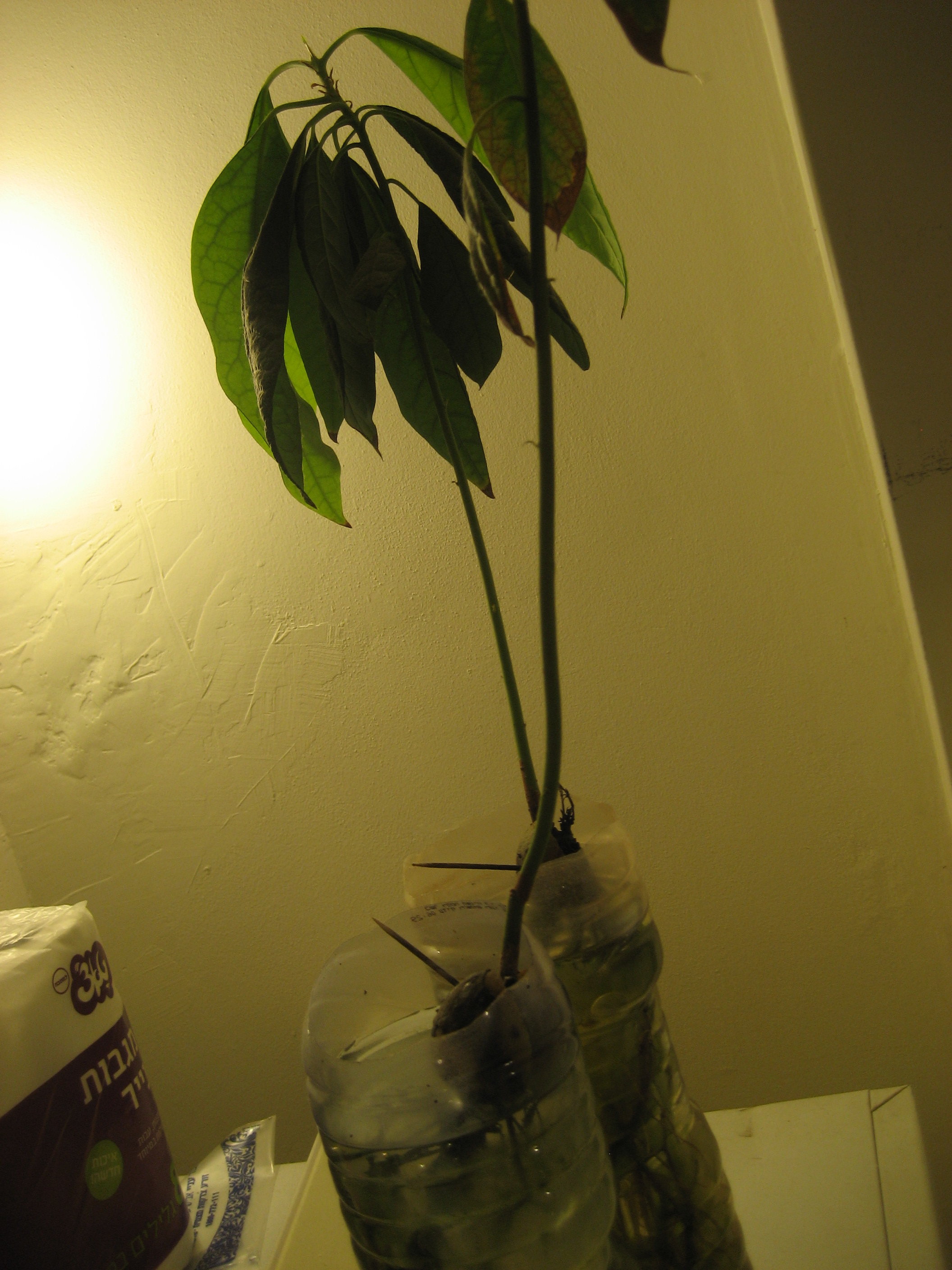 שמנו לפני בערך שנתי'ים גרעין אבוקדו(עם קיסמים-שיחזיקו)בתוך מים,בהתחלה בכוס קטנה אח"כ גדל שורש ונתקע אז העברנו לכוס גבוהה והמשיך לצמוח השורשים העברנו למיכל אחסון ח"פ של ליטר וכך הלאה עד שהעברנו לבקבוק 2 ליטר שחתחנו את הפי'ה למעלה,האבוקדו צמח וצמח הוציא שורשים והתחיל גם לצמוח לגובה ולהוציא עלים ירוקים גדולים ויפים.