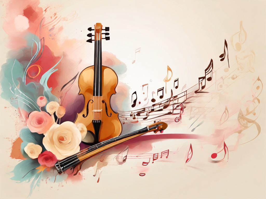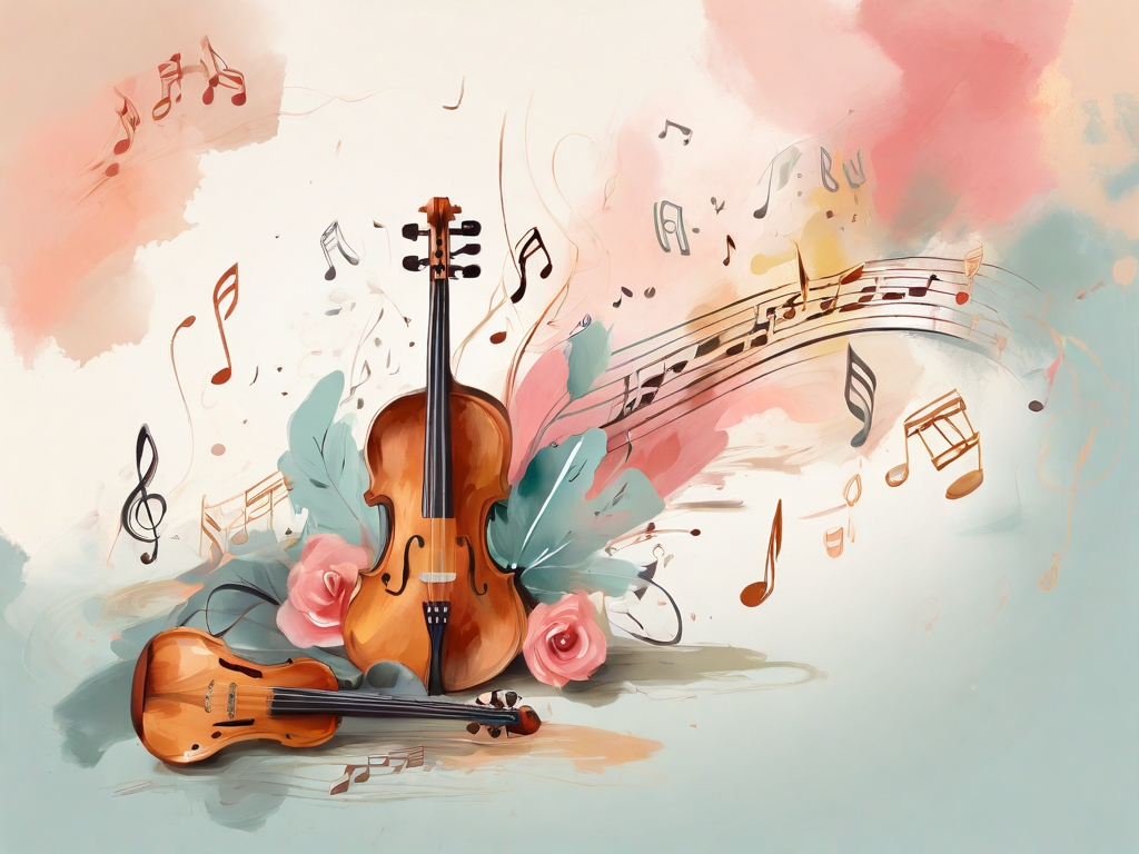 A designed background page, notes, soft colors, musical instruments in the style of brush strokes