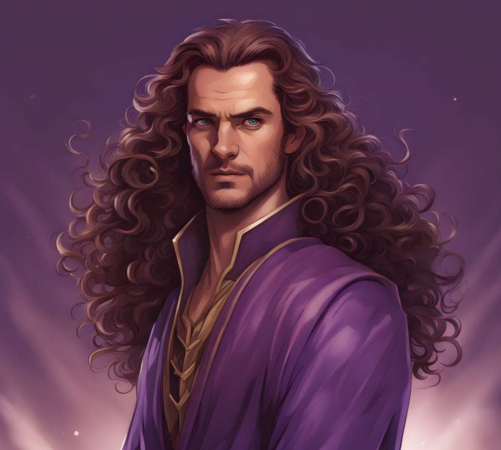 A man in his 30s with superpowers with an imposing looking purple cloak, partially purple eyes and long brown curly hair that reaches his waist.