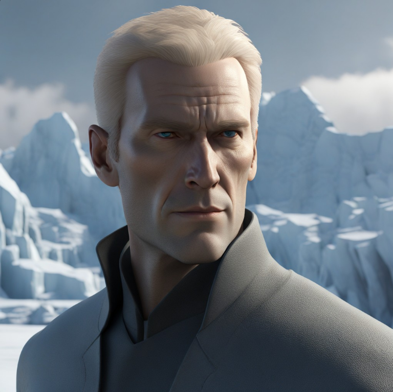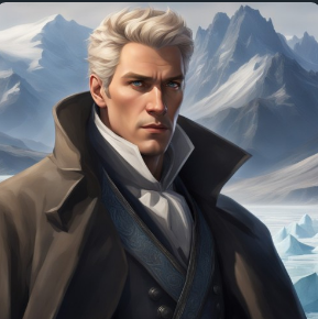 An imposing and tall man, with a sly look. Short blonde hair that turns gray at the ends. His cheekbones are high, and his eyes are blue-gray like a sea of ice. A view of high mountains covered with ice behind him.