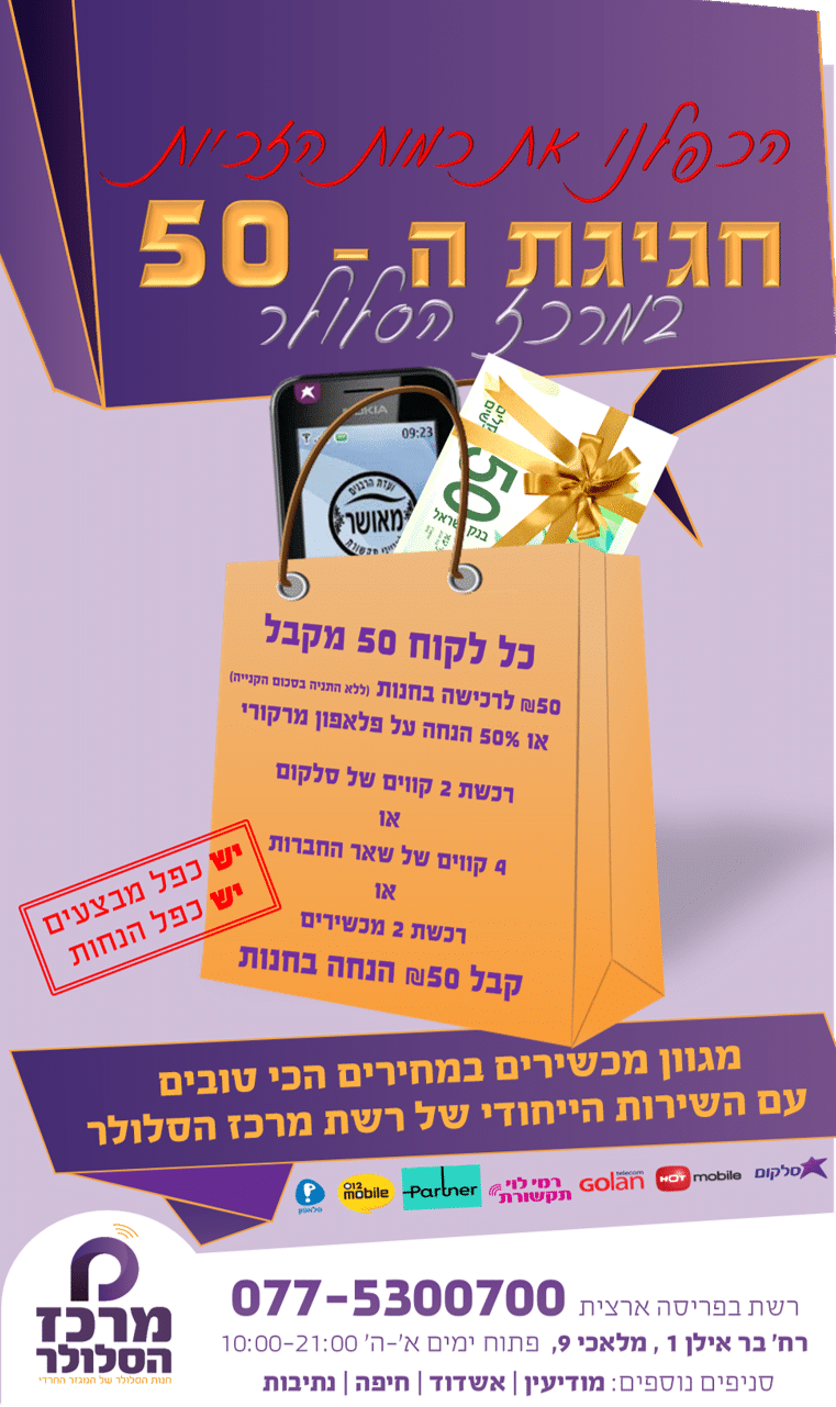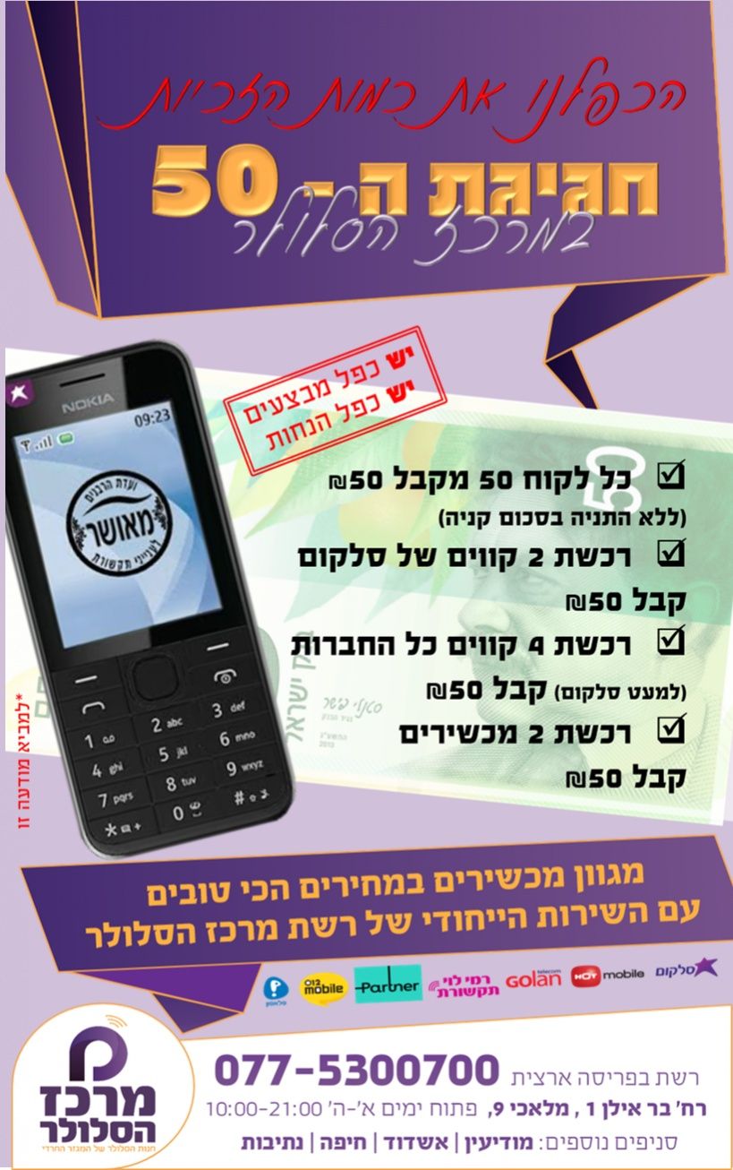 לדעתי כדאי לוותר על השטר ברקע. ובמקום זה כדי להדגיש את ה- 50 כדאי להגדיל את המחיר ולהתאים אותו ל50 שבכותרת.