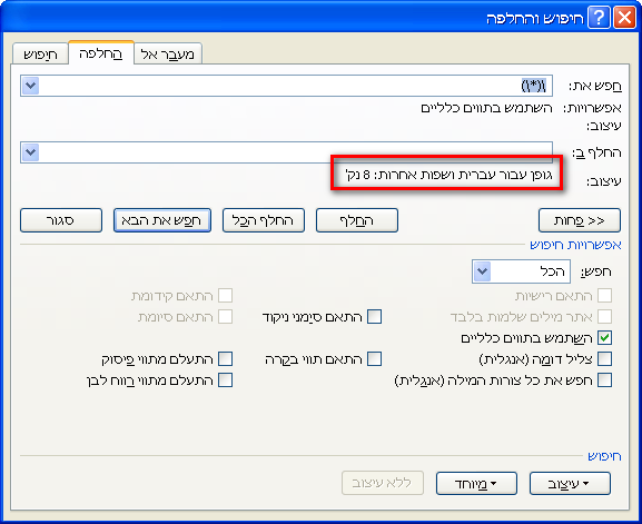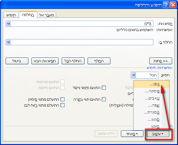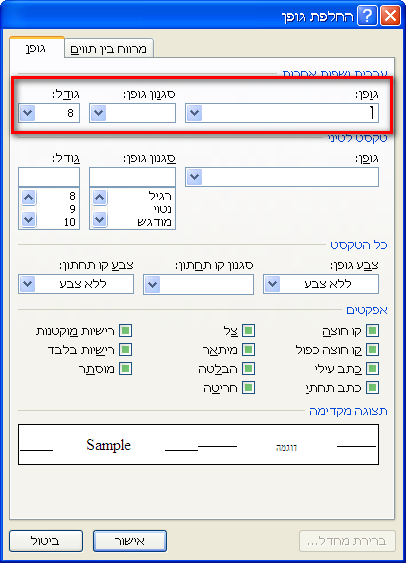 בתיבה החלף תבחר בעיצוב גופן ותשנה לגודל הרצוי