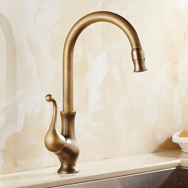ברז מטבח נחושת עתיק, ידית אחת חור אחד מסתובב ברזי מטבח זרבובית רגילה עם מים חמים וקרים