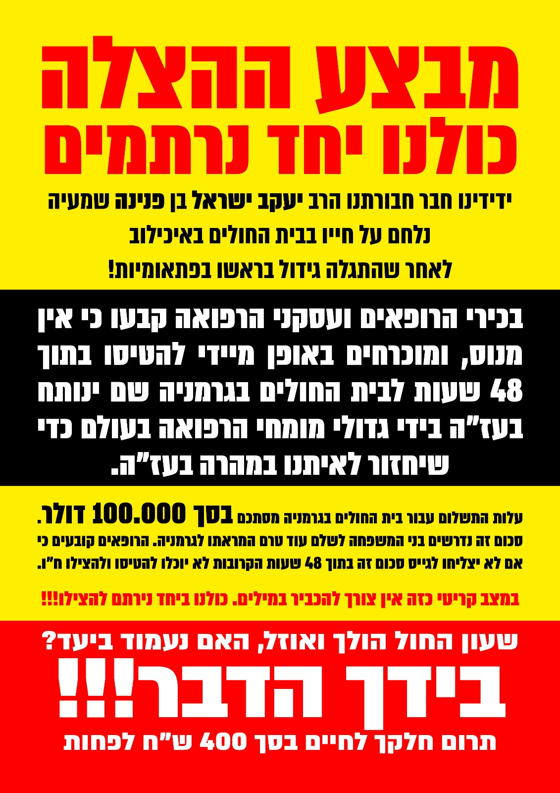 ידידיו ומכריו של האברך יעקב ישראל בן פנינה יצאו למגבית חירום להשגת סכום עתק של 100,000 דולר על מנת להטיסו לחו"ל עוד השבוע לניתוח דחוף. חסידי קרלין סטולין נרתמו כולם לעניין והופכים עולמות כדי להגיע לסכום הזה ולהחזיר לרעייתו ולילדיו את אביהם הצעיר כשהוא בריא ושלם.