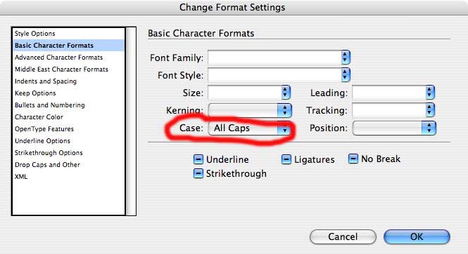 2. יש אפשרות לשנות הגודל האמיתי של האותיות (כאילו נכתבו בCaps Lock). זה דרך התפריט Type-->Change Case. יש כמה אפשריות שם. אחד מהם זה כמו shift f3 בוורד. האפשרות הזו נקרא sentence case. יש גם uppercase, lowercase וTiltle Case.