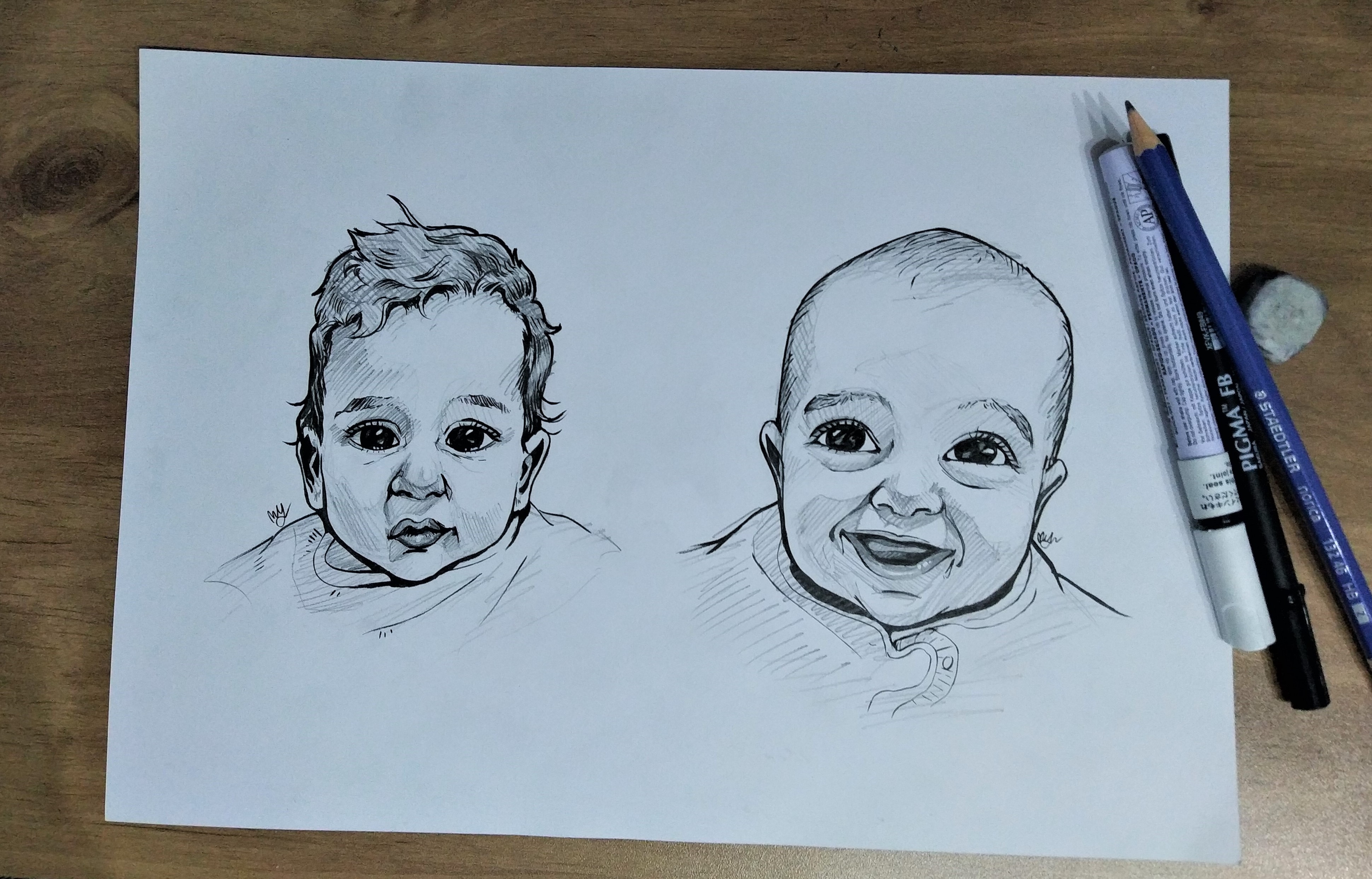 אלו ציורים של 2 תינוקות אמתיים ומתוקים מאד... צוירו בעזרת עפרון רגיל, עט פיגמה FB ועט לבן.