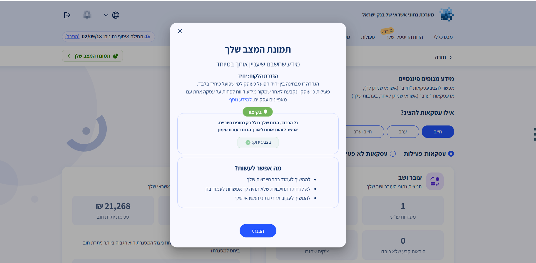 לפני כל תיק שאני מתחיל לעבוד עליו אני עובר קודם על דוח נתוני אשראי מבנק ישראל, ניתן להזמין את דו"ח נתוני האשראי מבנק ישראל בקישור שם לא כתוב במספרים מה הדירוג אבל כן ניתן לראות אם הלקוח טוב בעיני הבנק או לא https://www.creditdata.org.il/איך אני יודעת מה דירוג האשראי שלי?