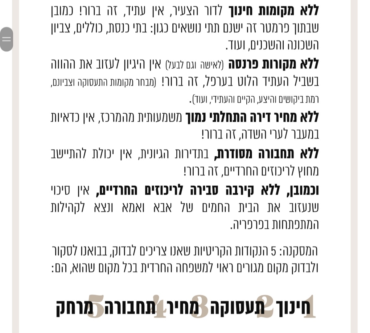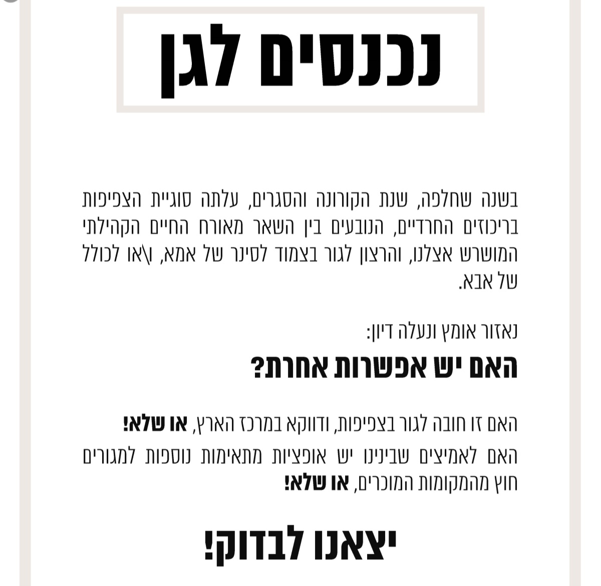 חלילה, כמה שיותר להשקיע בנדל"ן וכל המרבה הרי זה משובח – ואם ירצה השם ויהיה זמן נרחיב אולי בטור הבא על "מה כן" – אך רק עסקאות נטולות הימור על כל הקופה, כך שגם אם נגזר עליך להפסיד זה יהיה רק קצת ורק זמני.